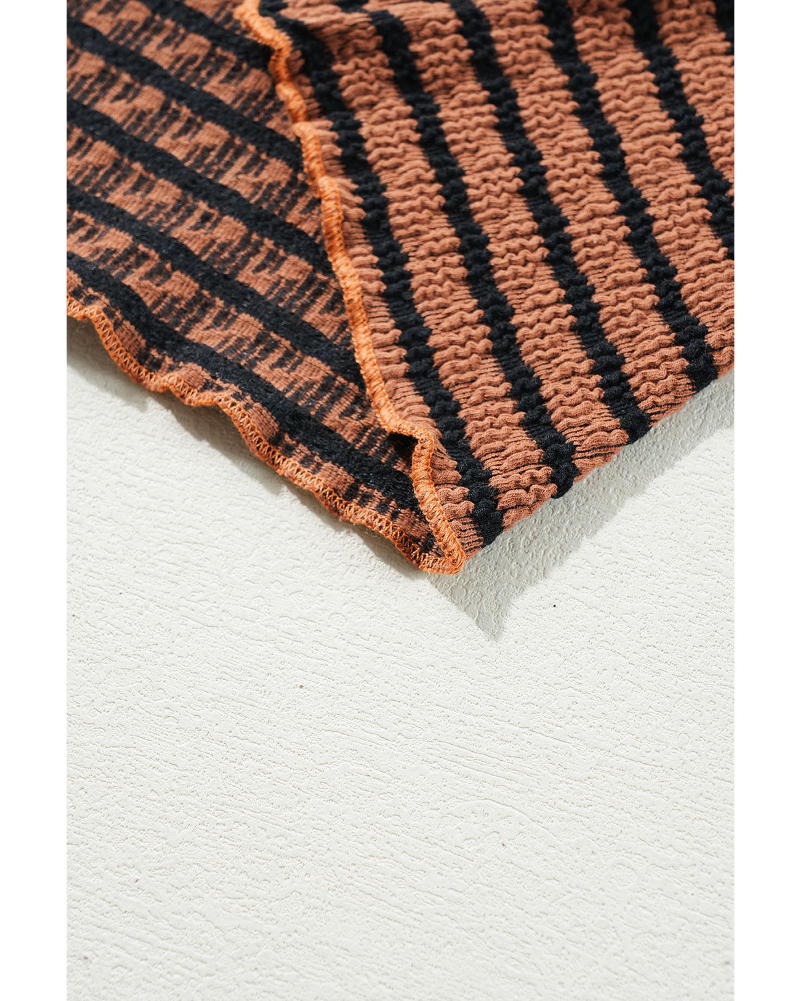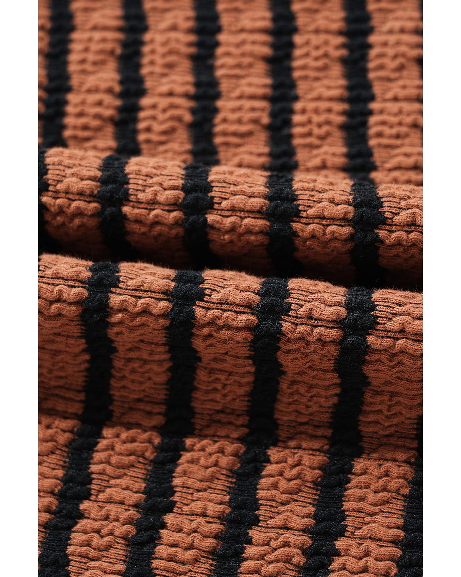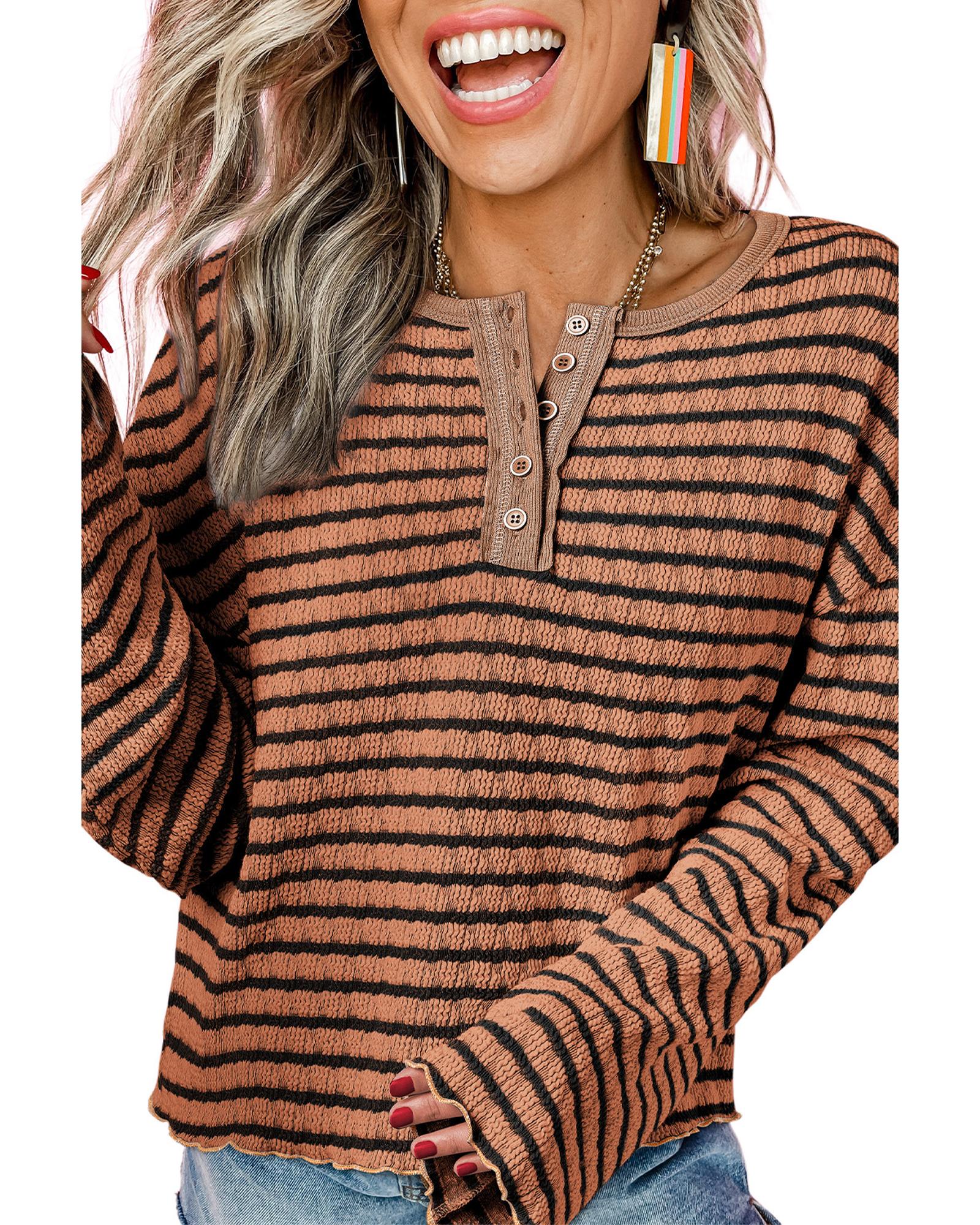 - Brown Stripe Textured Frilly Trim Buttons Henley Long Sleeve Top