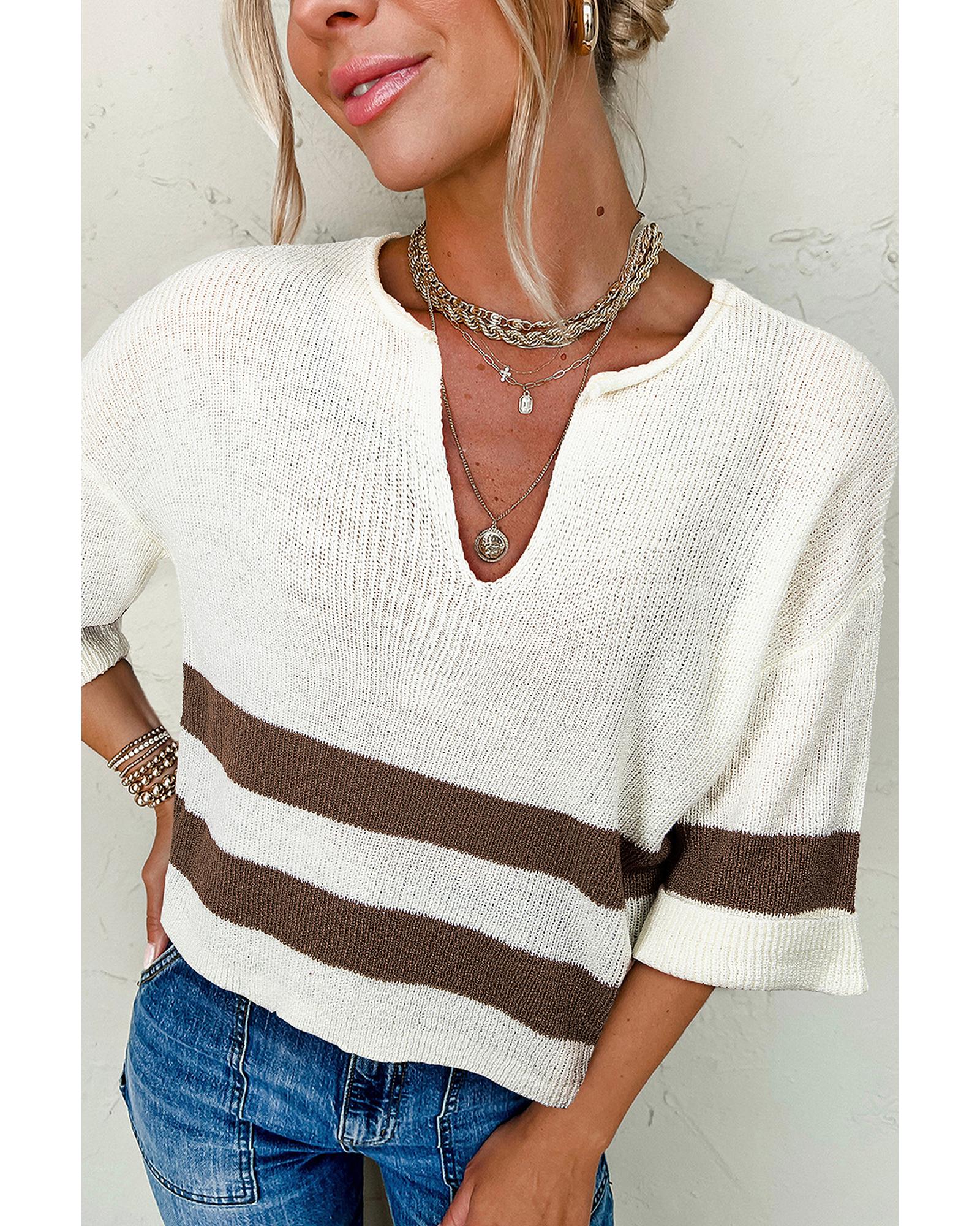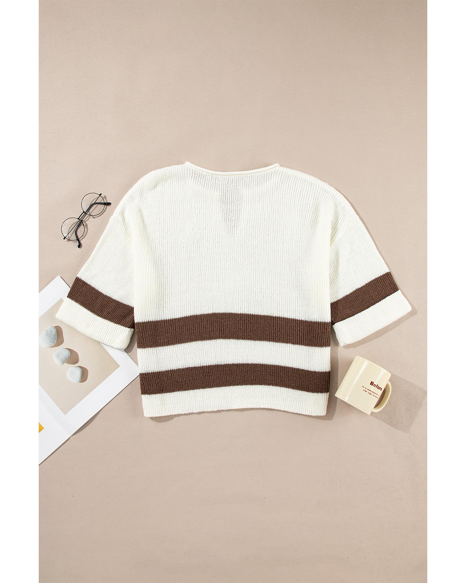 • Brown Striped Accent Notched V Neck Cropped Sweater T Shirt