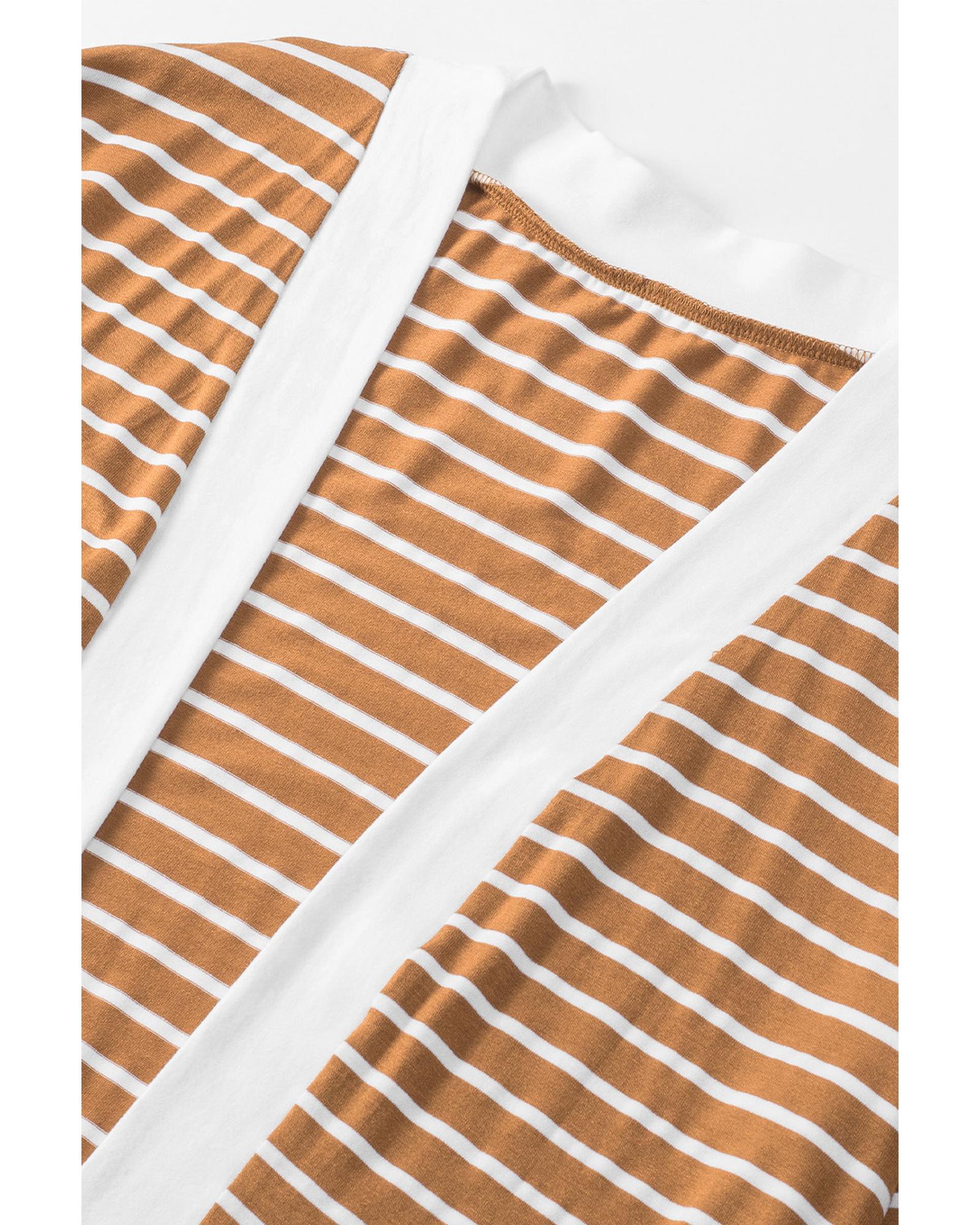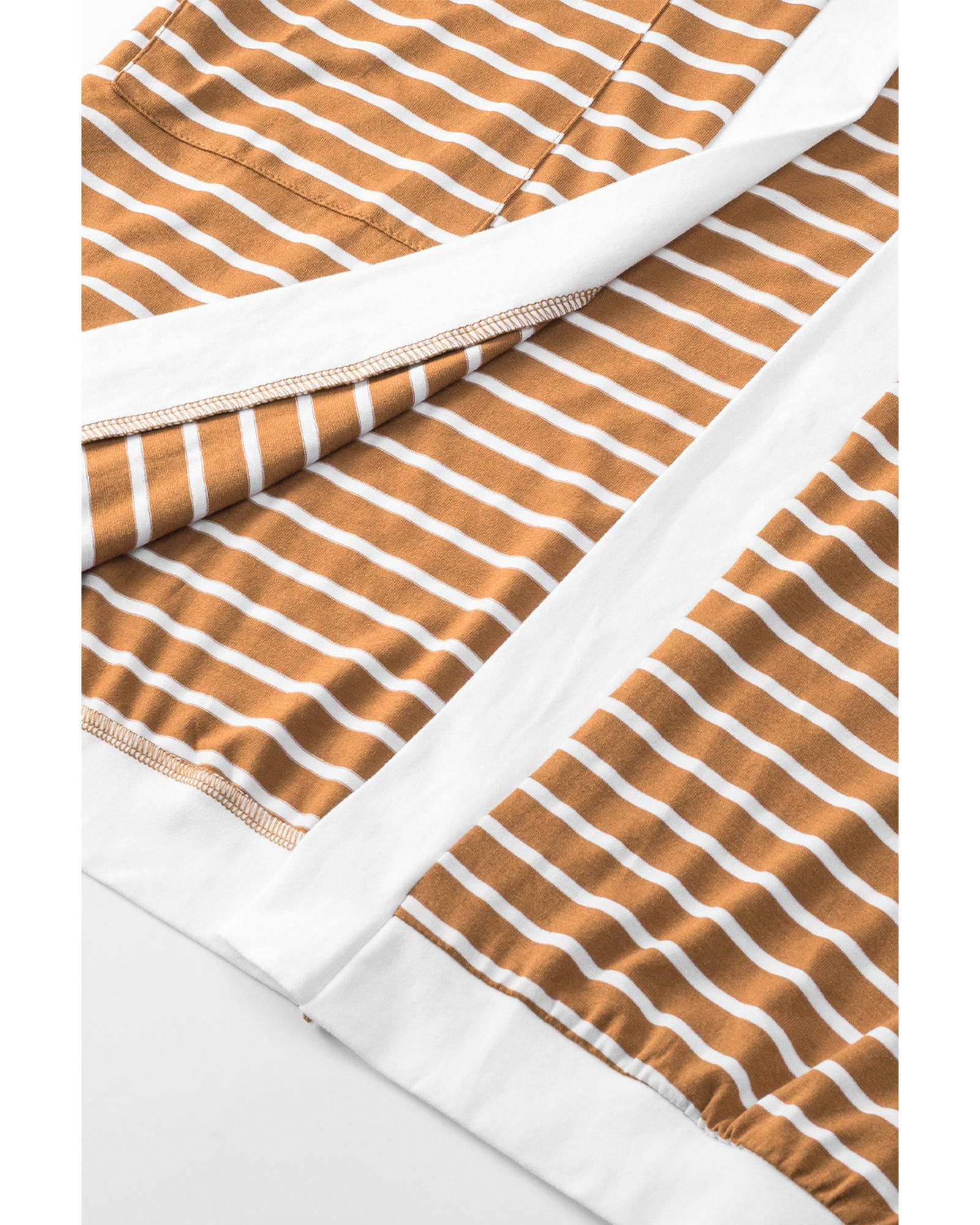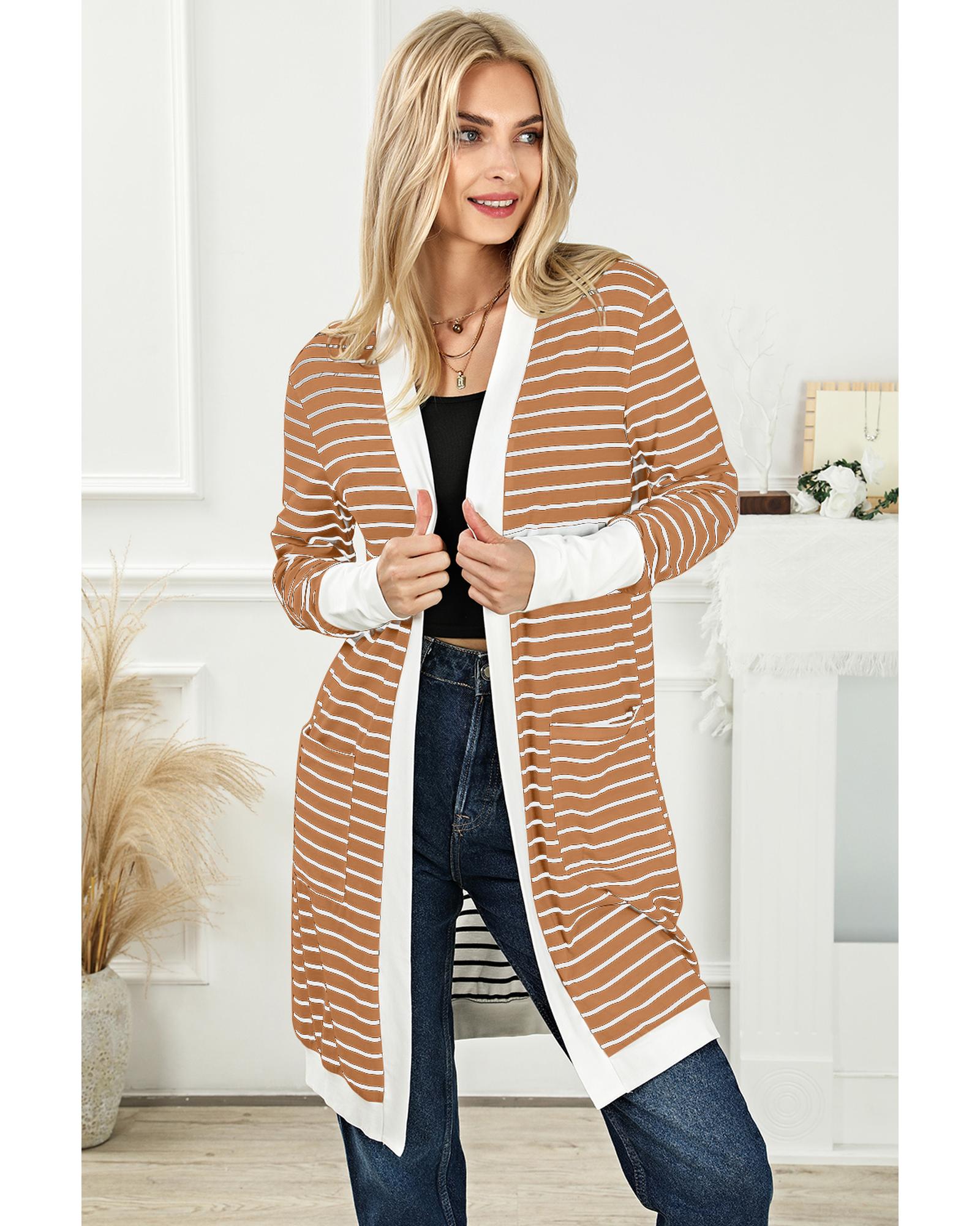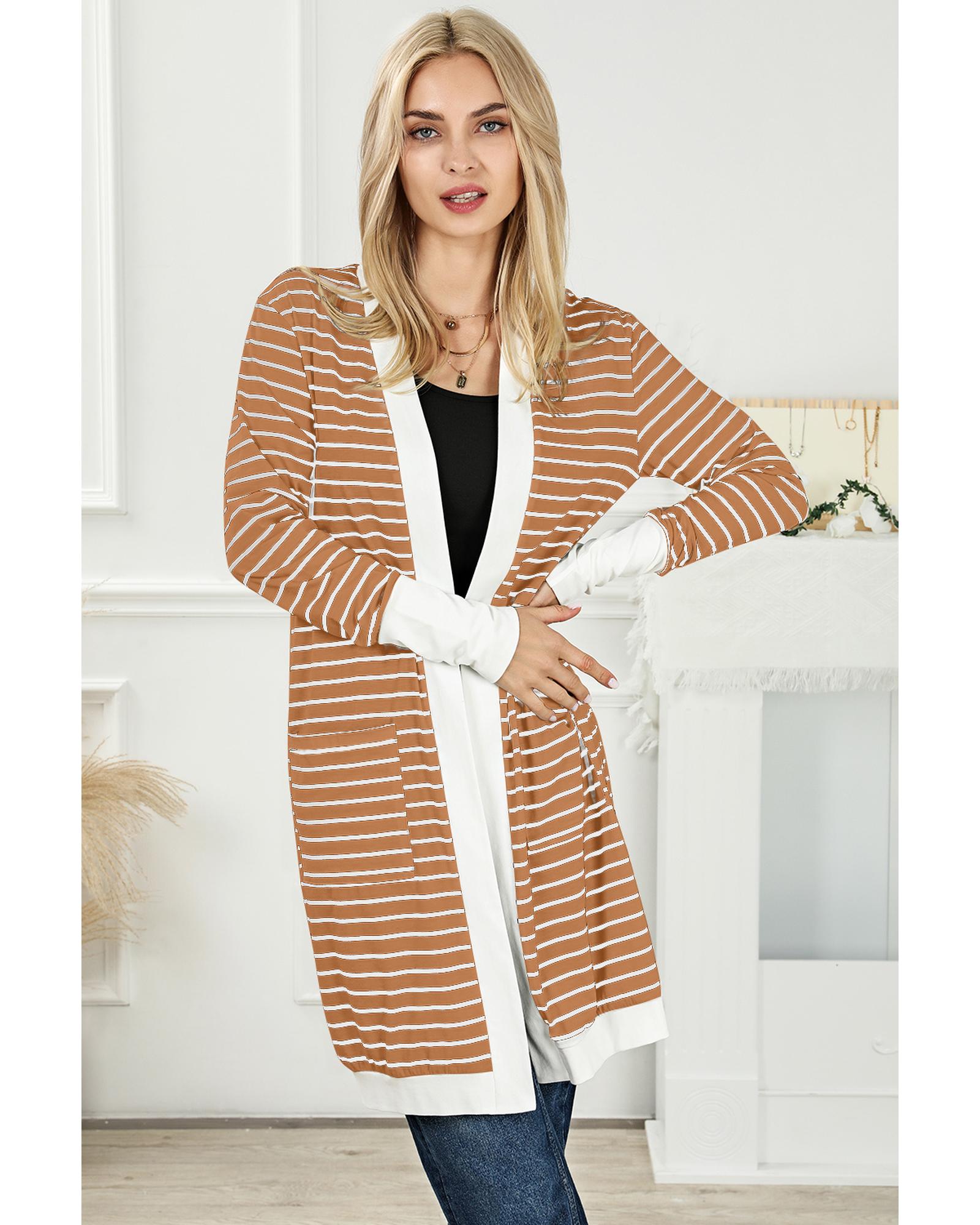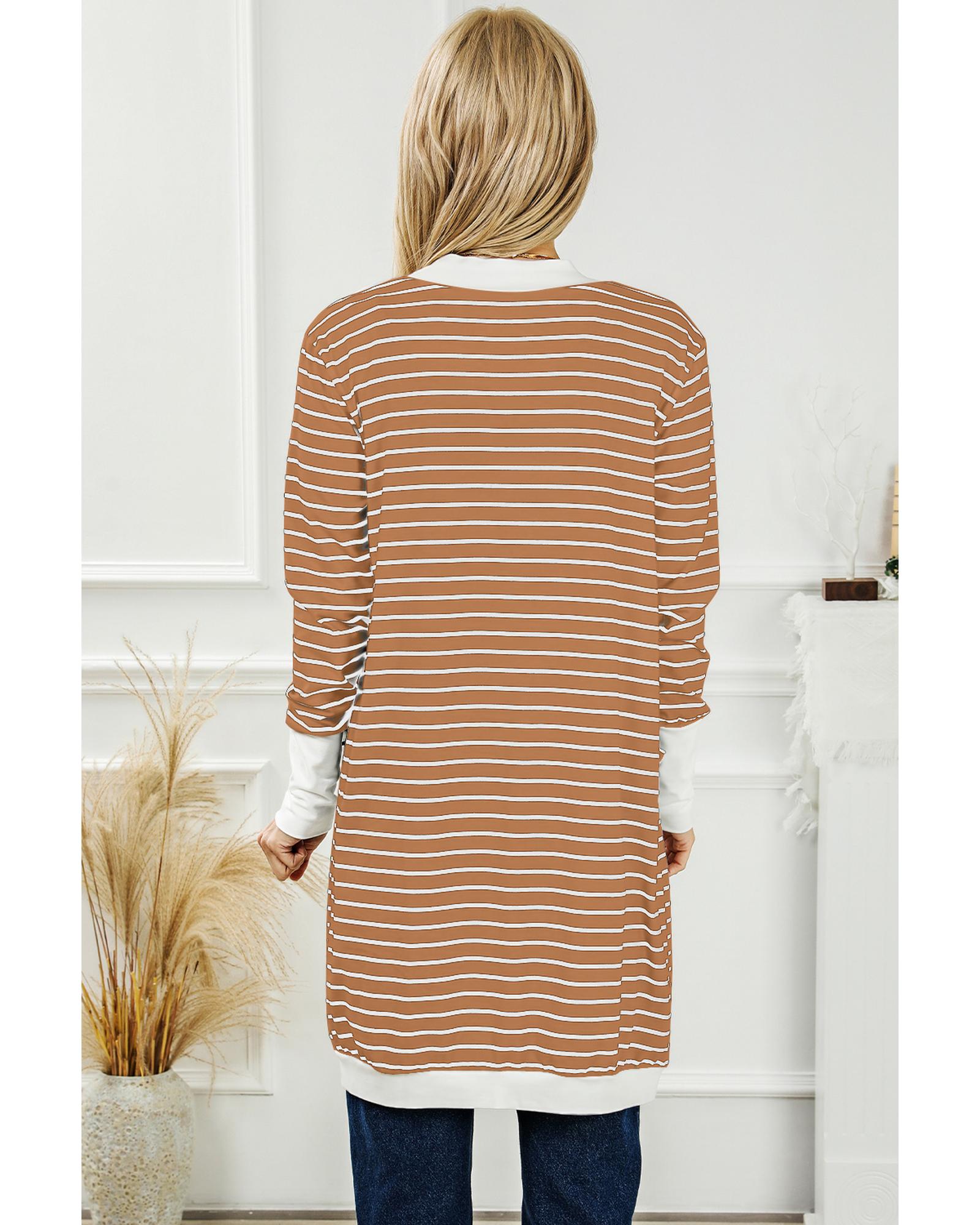 - Elevate your wardrobe with this versatile Brown Striped Side Pockets Open Front Cardigann