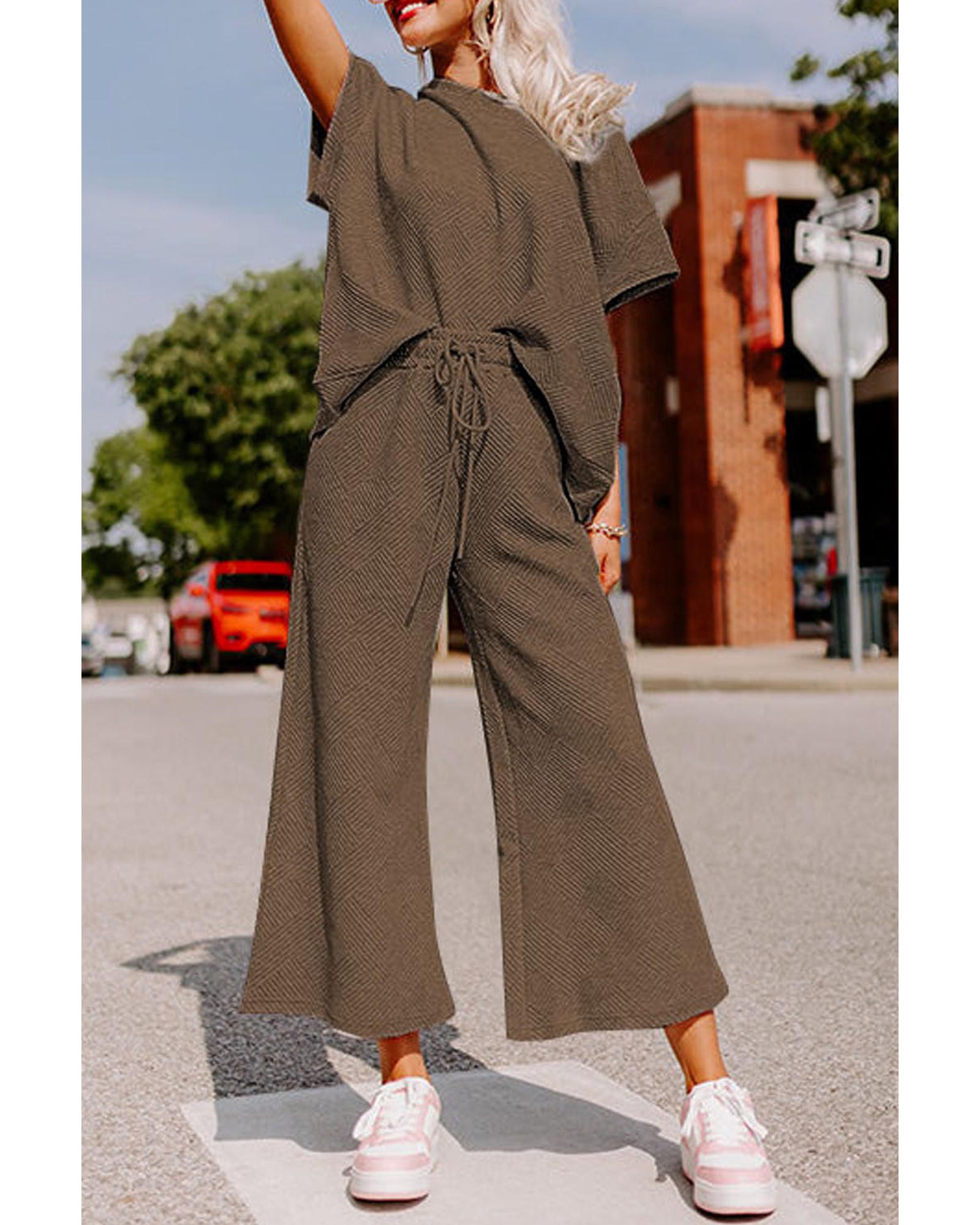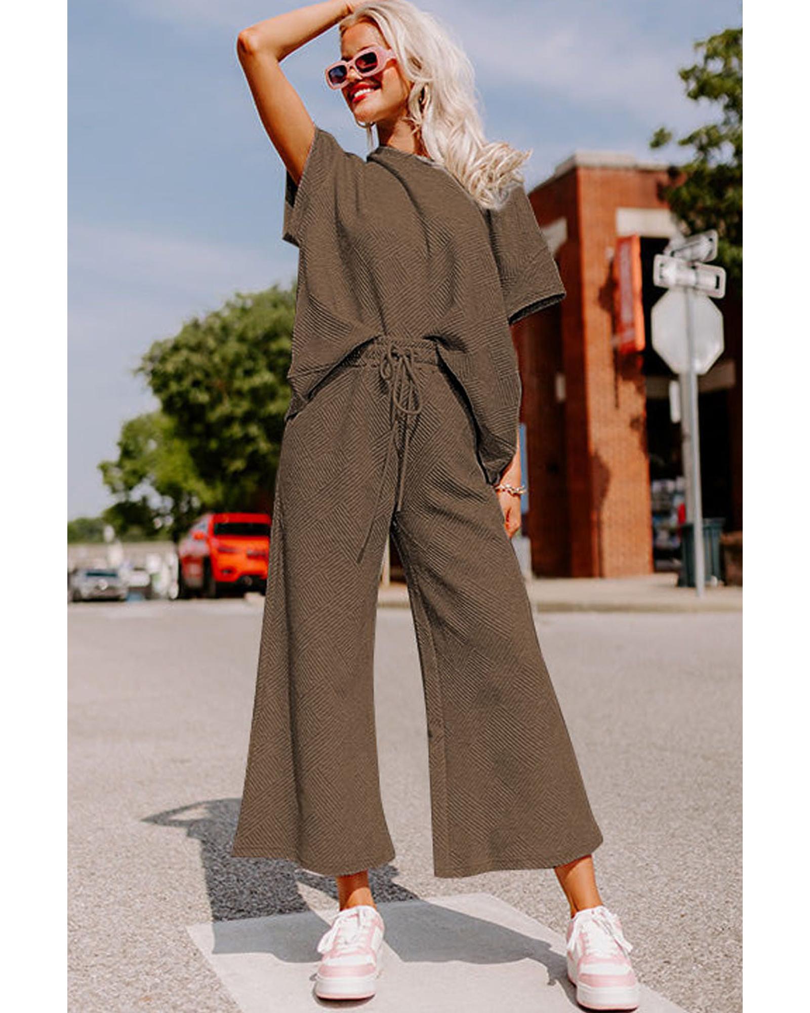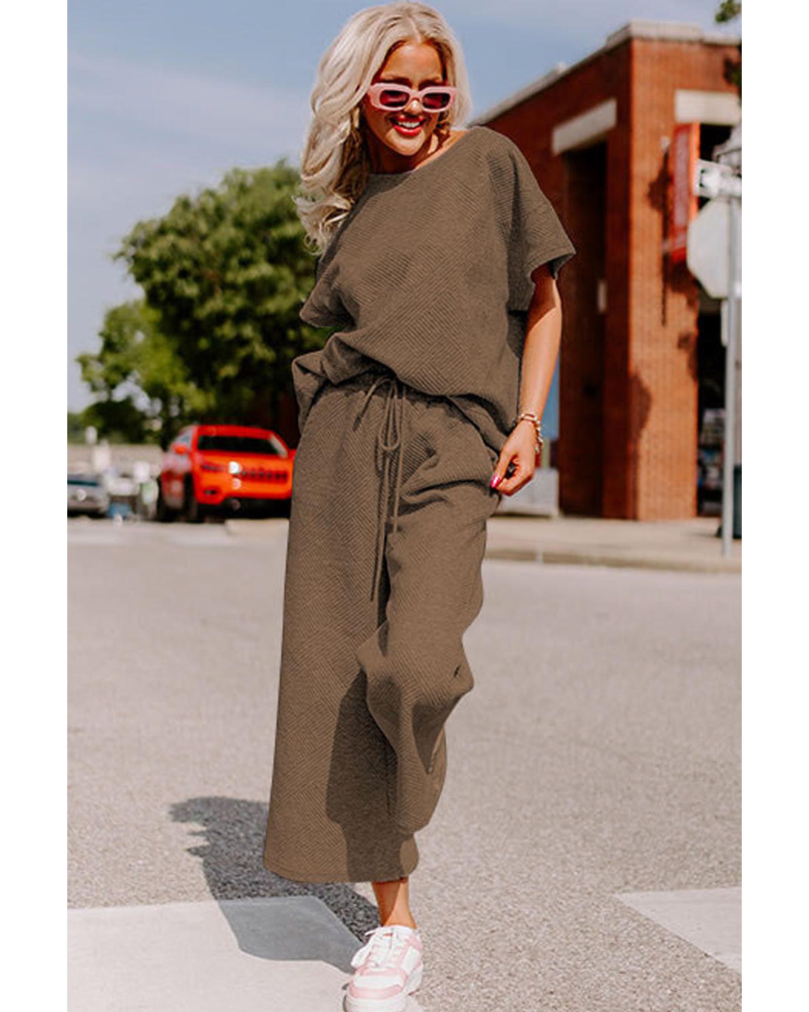Brown Textured Loose Fit T Shirt and Drawstring Pants Set - 2XL