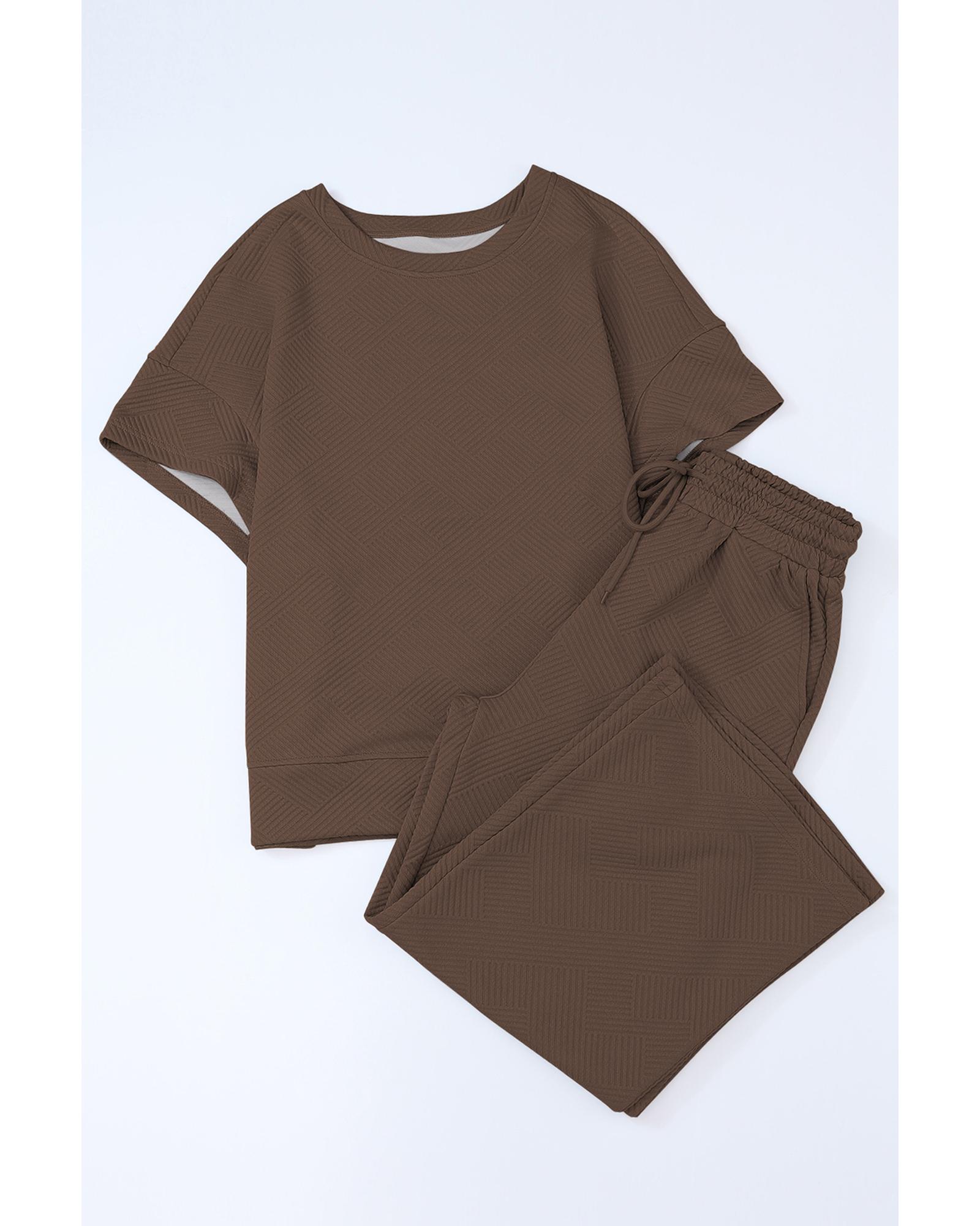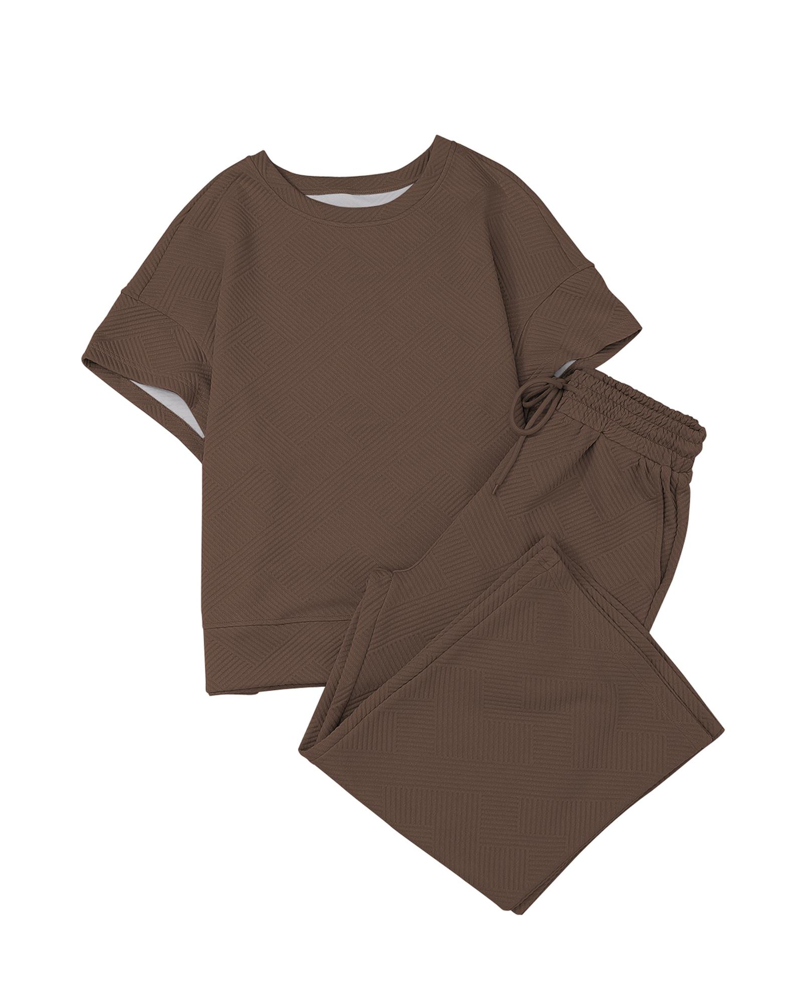 Brown Textured Loose Fit T Shirt and Drawstring Pants Set – L