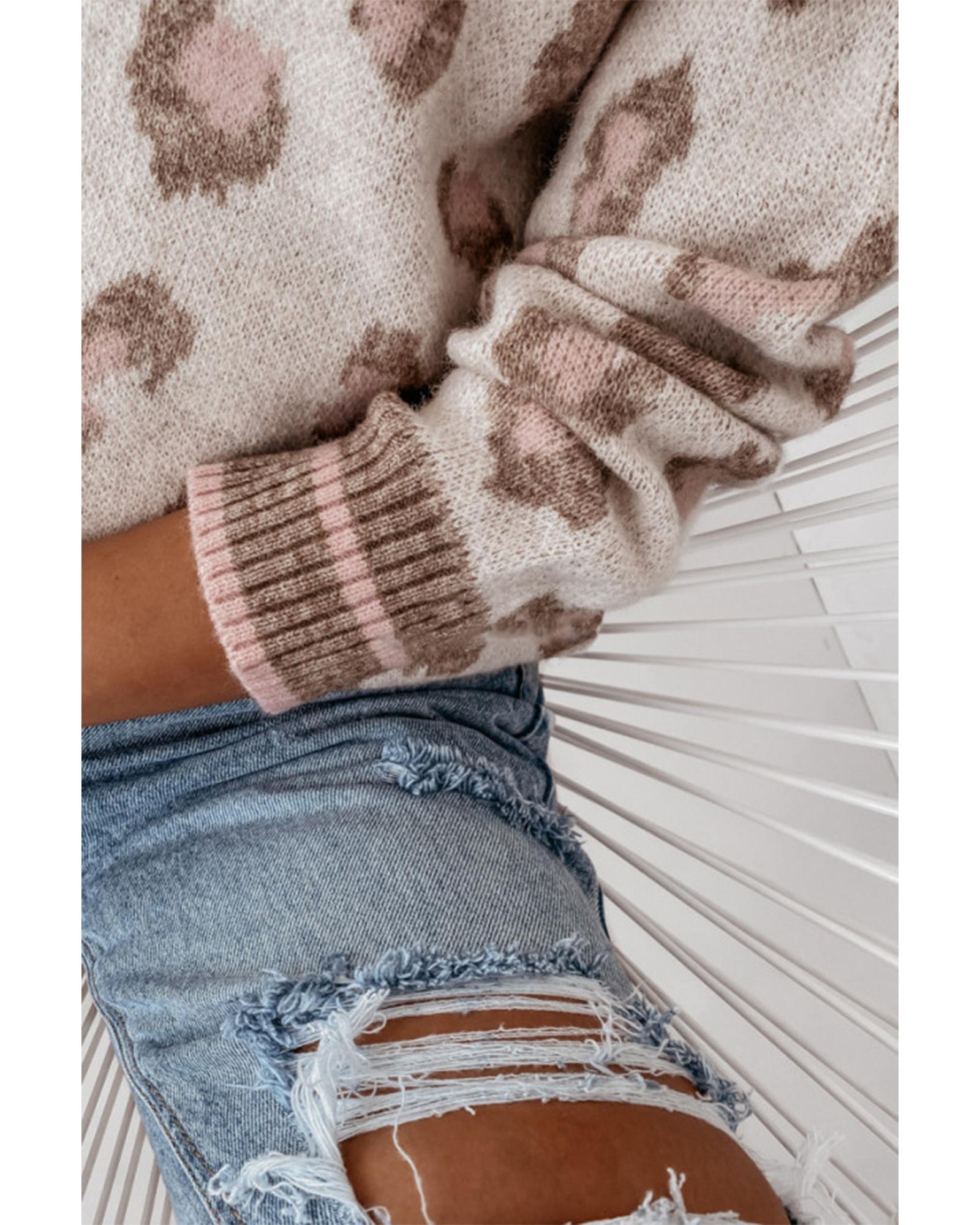 - tone Ribbed Trim Contrast Leopard Sweater