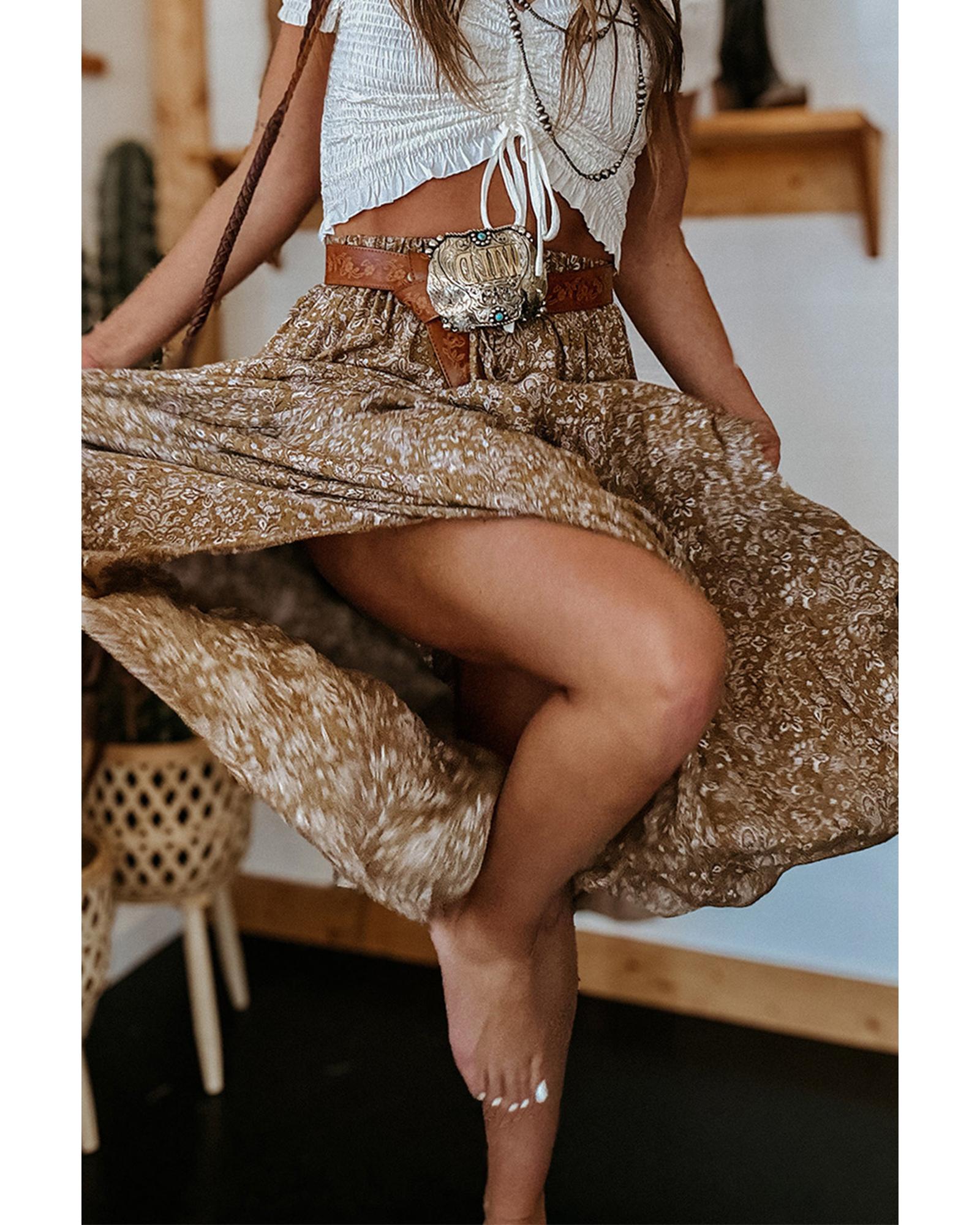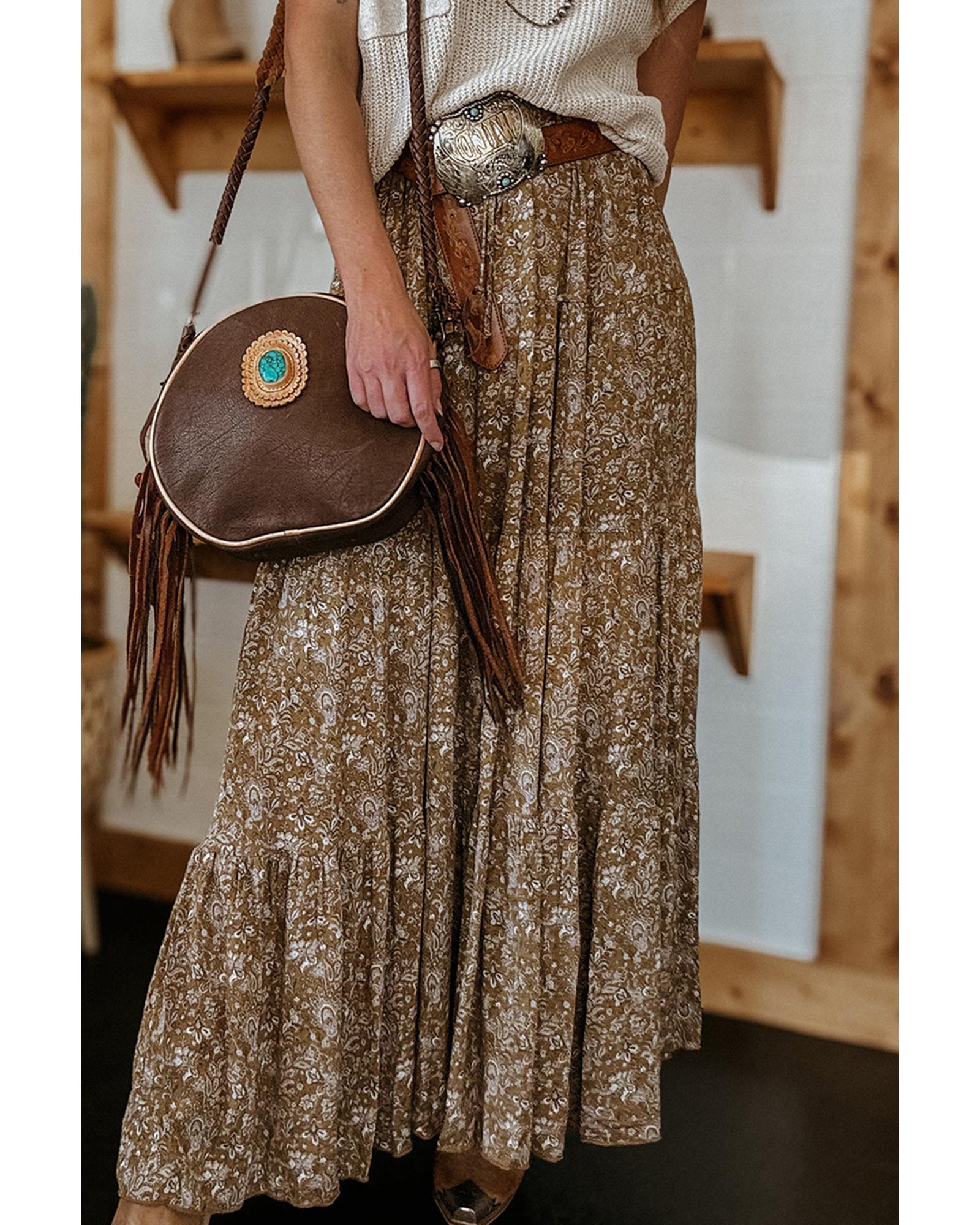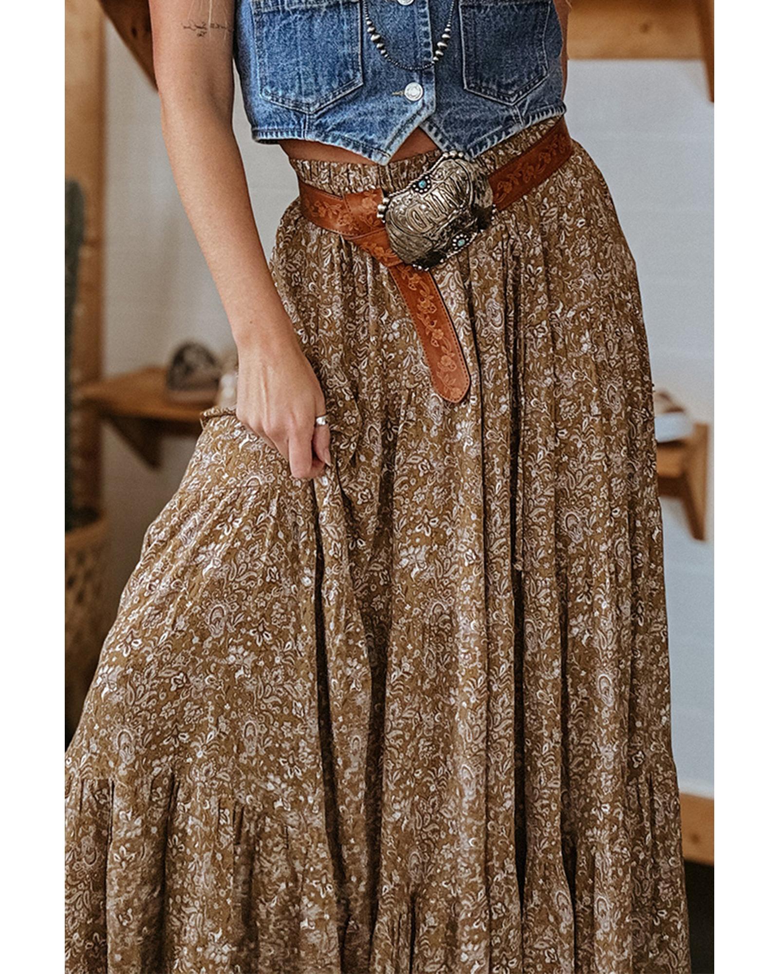 • Brown Western Floral Print Ruffled Hem High Waist Loose Maxi Skirt