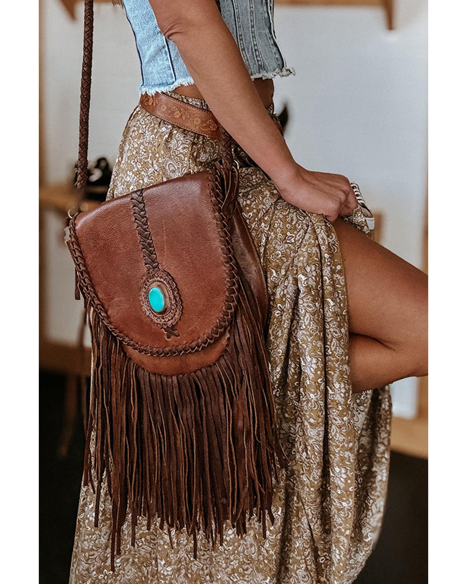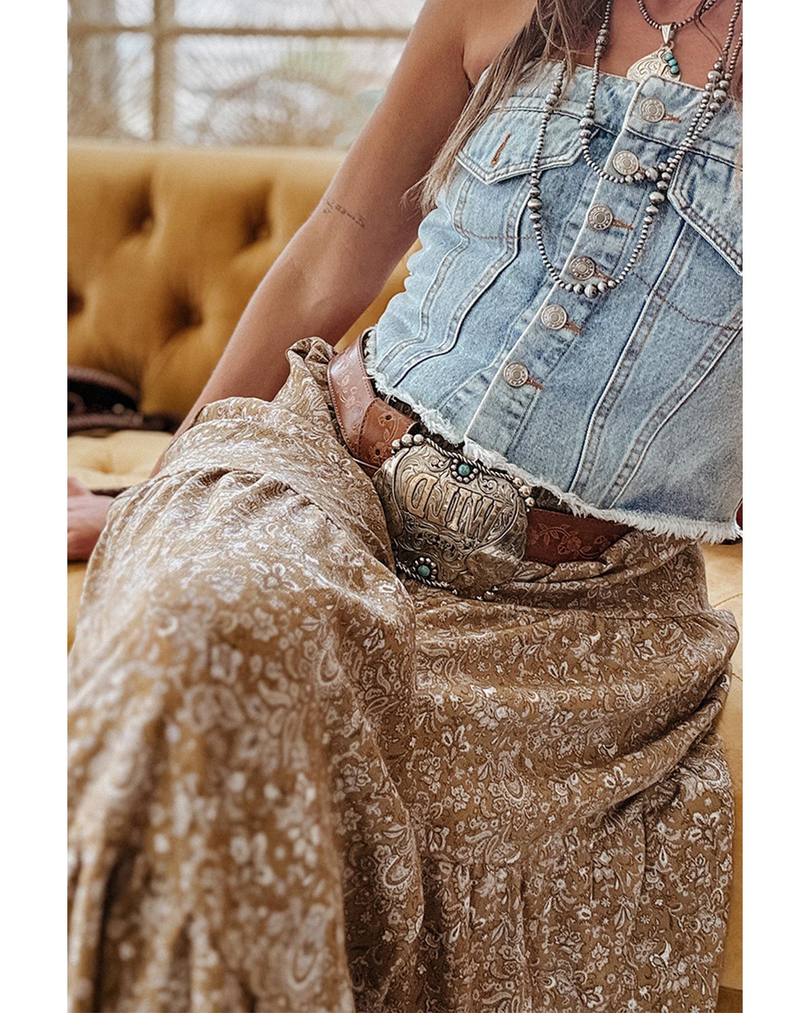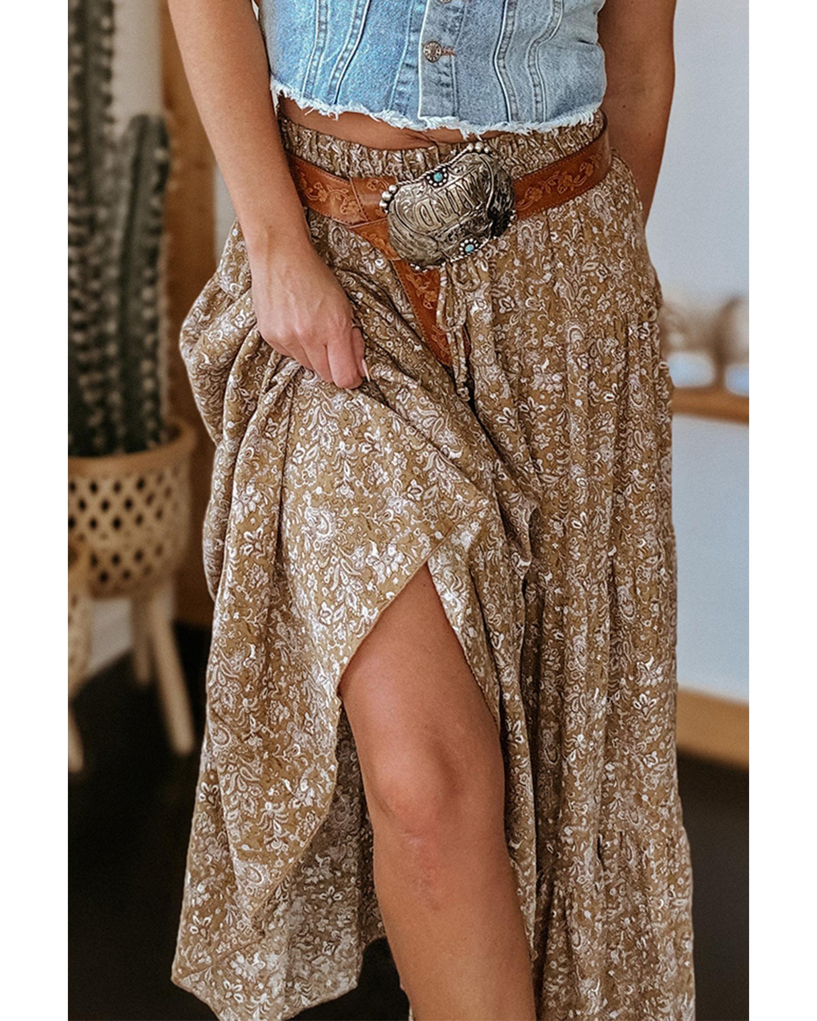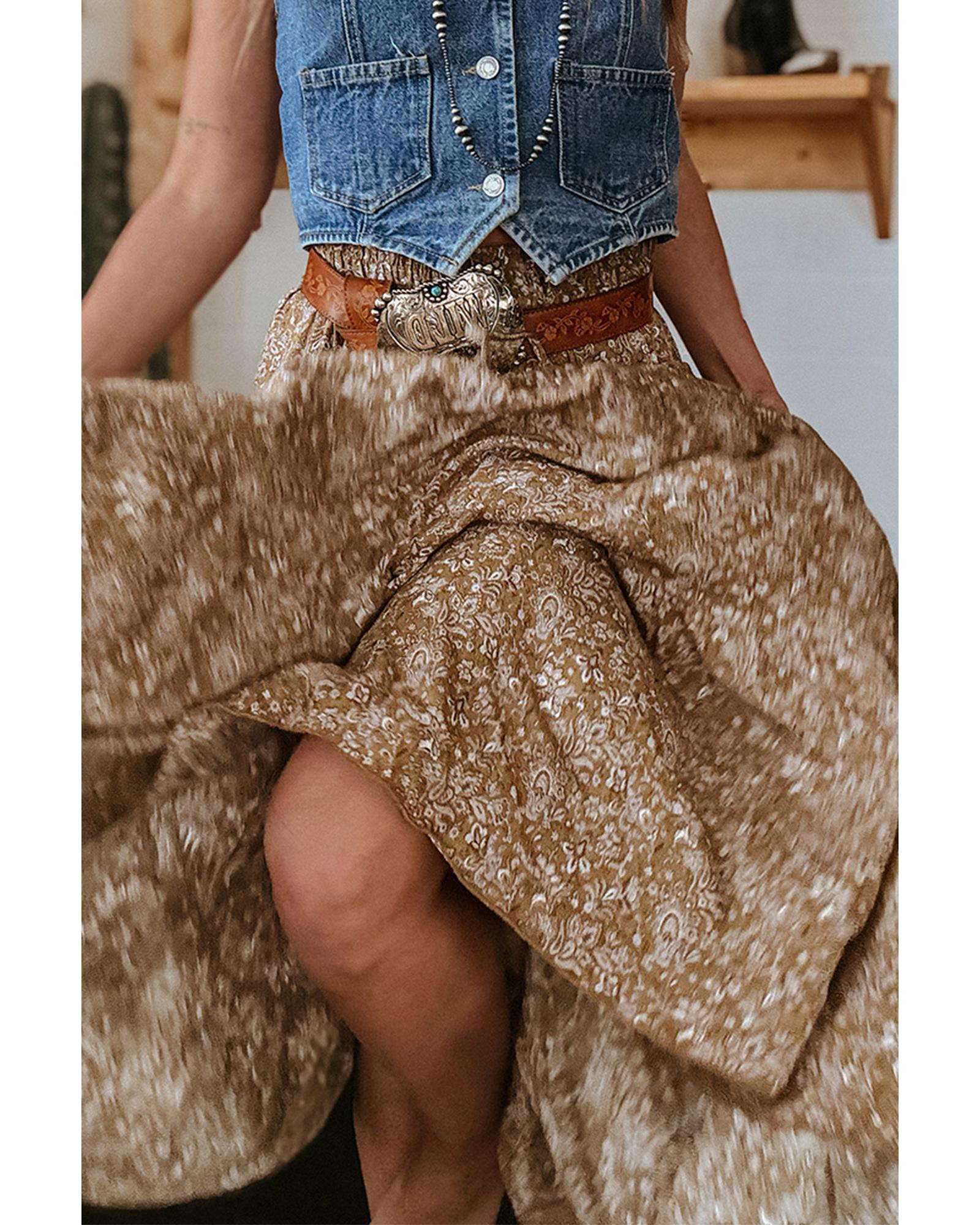 • Brown Western Floral Print Ruffled Hem High Waist Loose Maxi Skirt