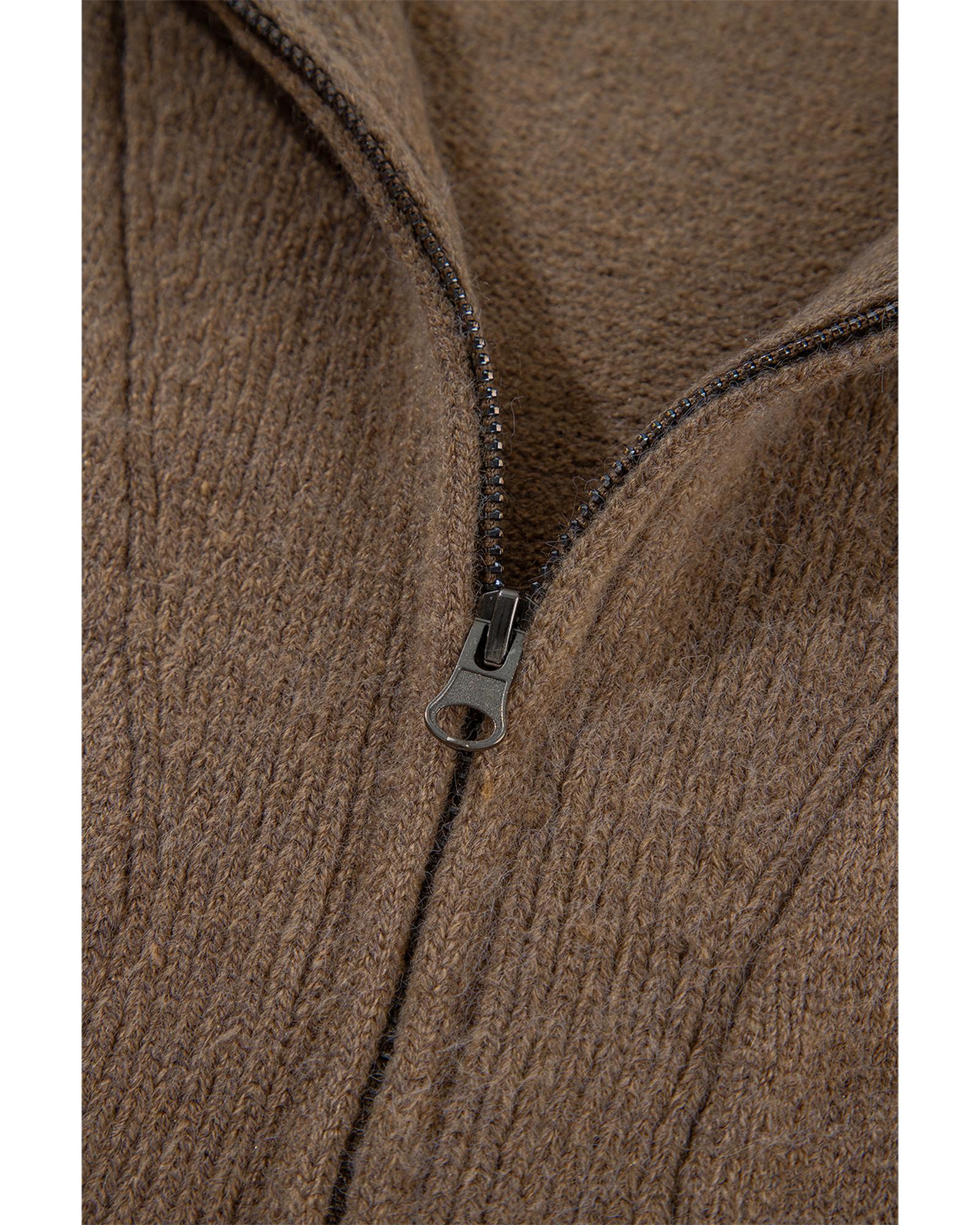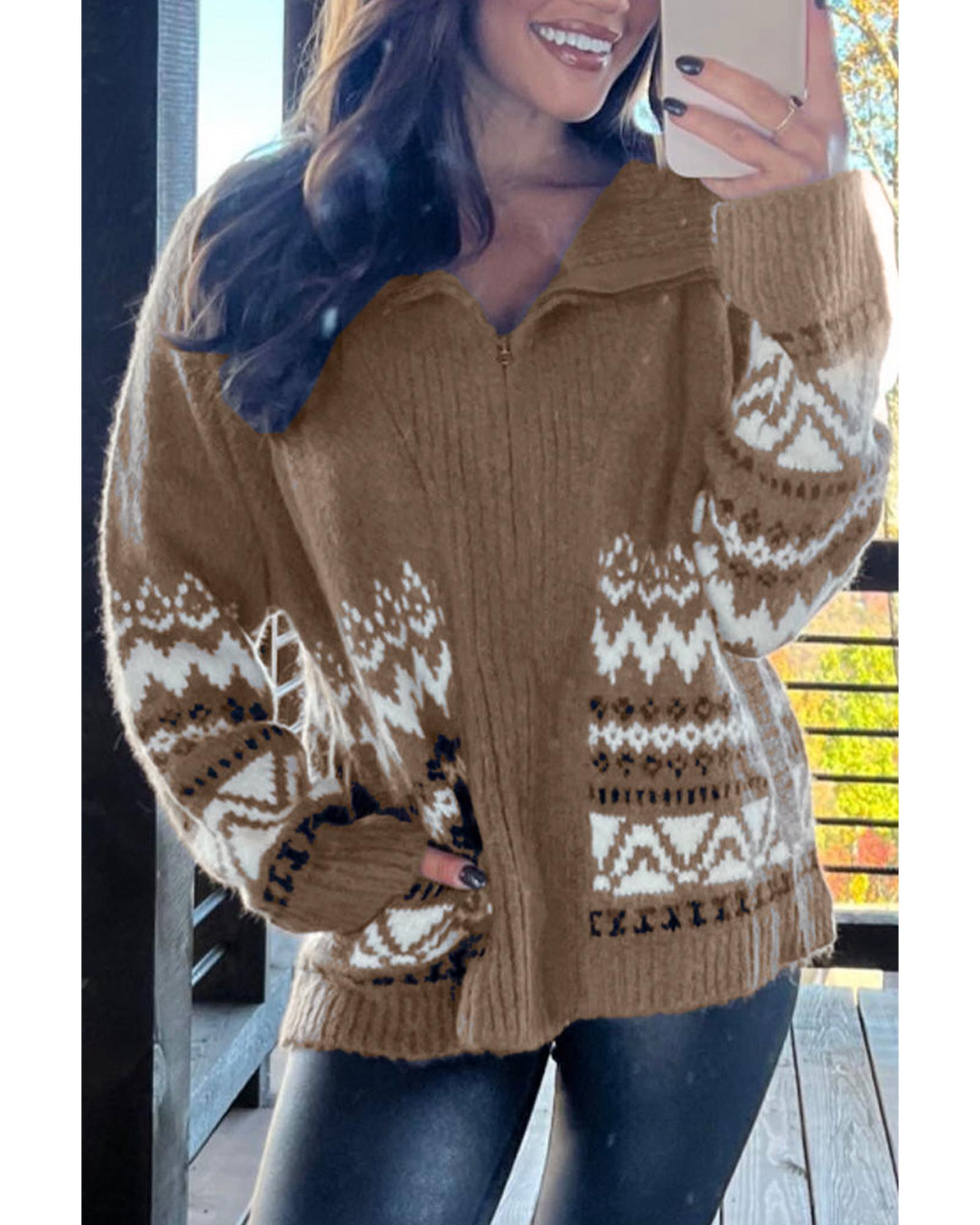 Brown Western Printed Ribbed Trim Collared Zip up Cardigan – XL