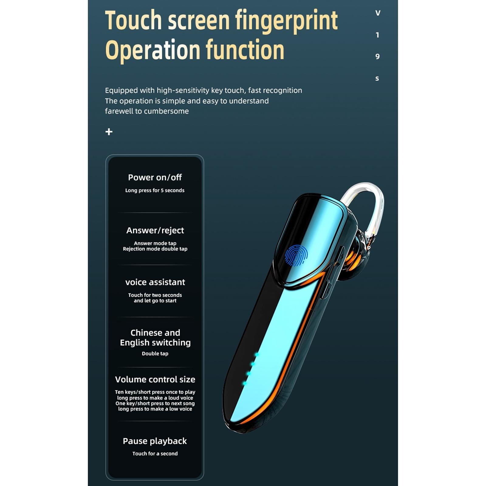 • 1 x V19S Business Style Fingerprint Touch Bluetooth 5.0 Earphone