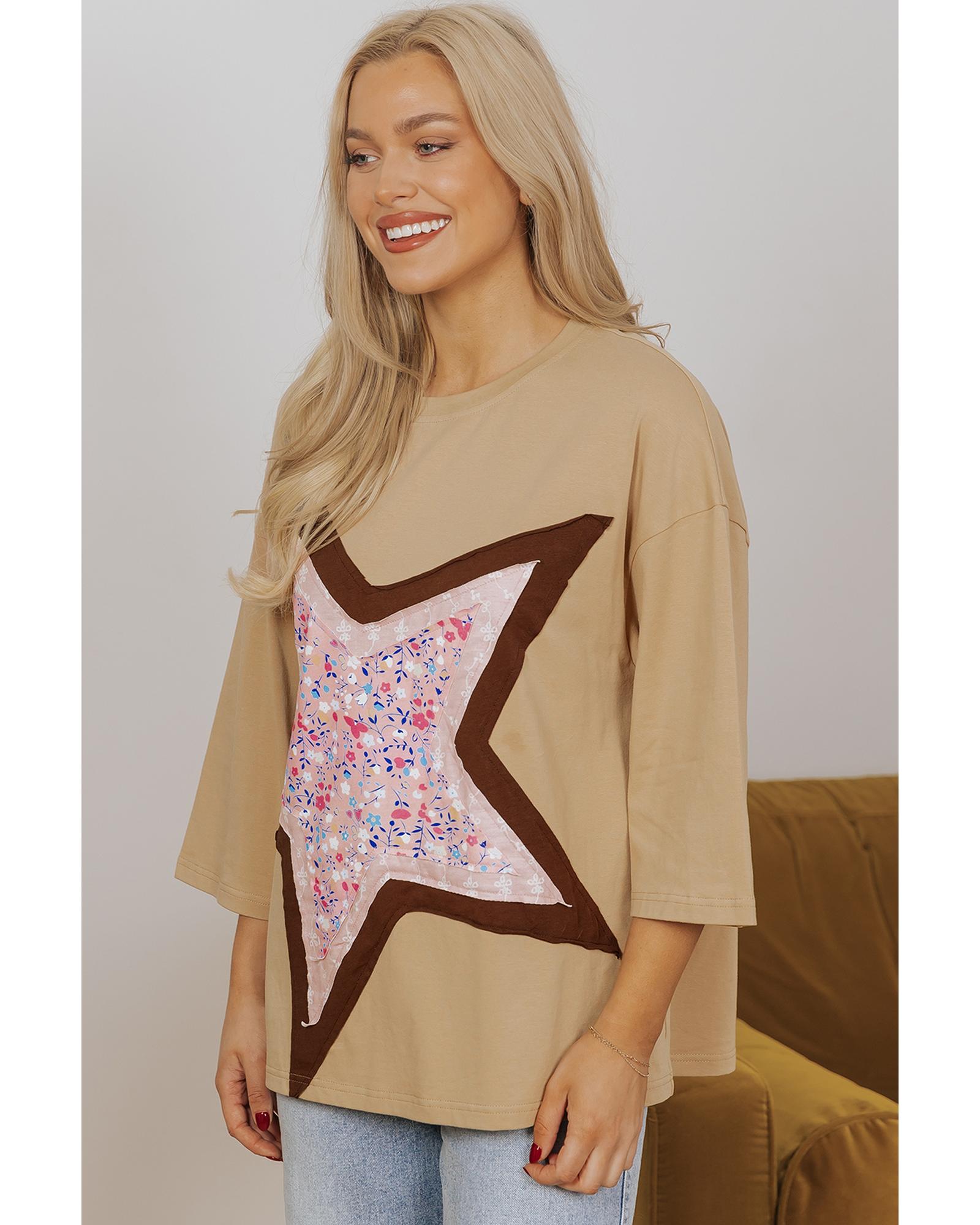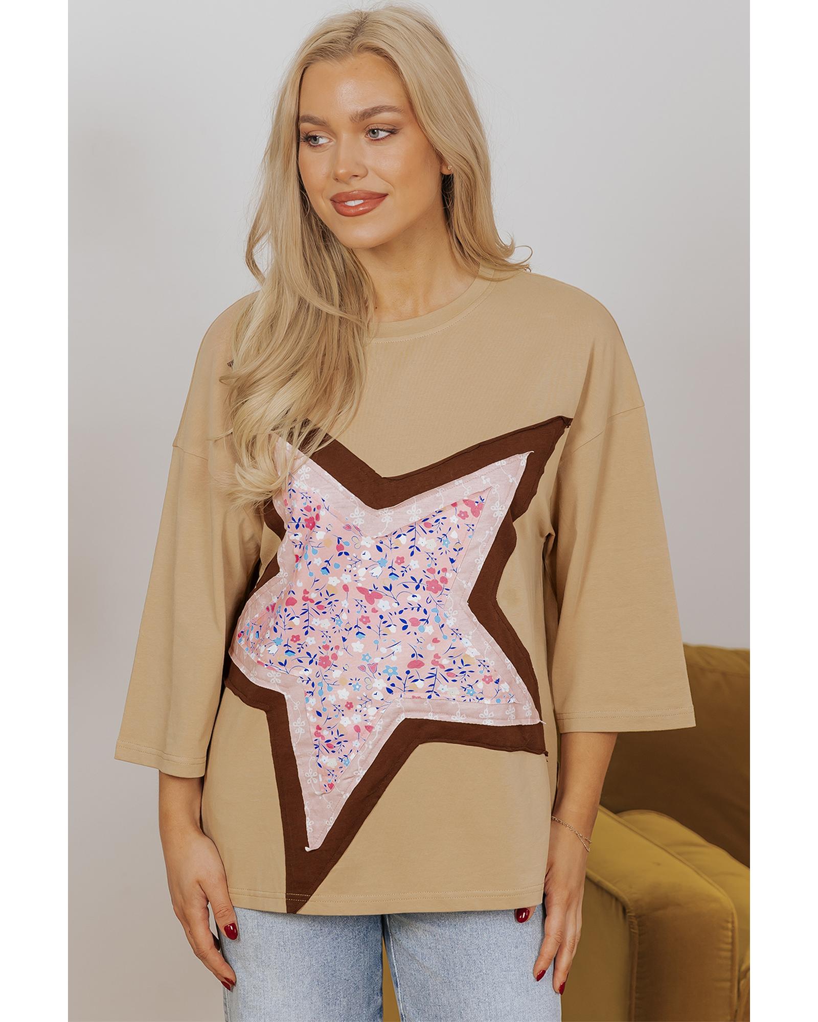 Camel Floral Star Patchwork 3/4 Long Sleeve Top – L