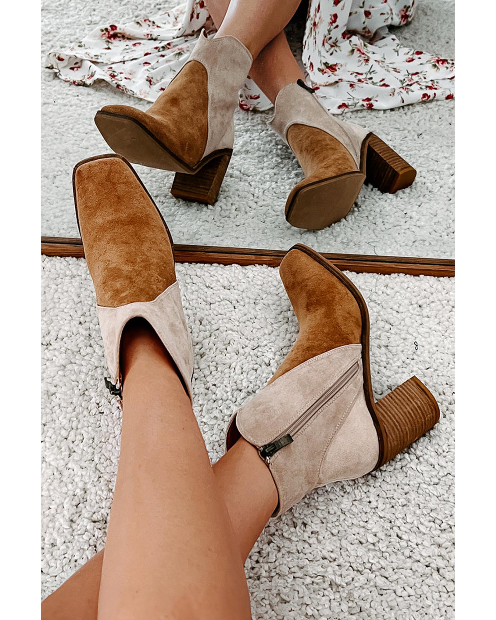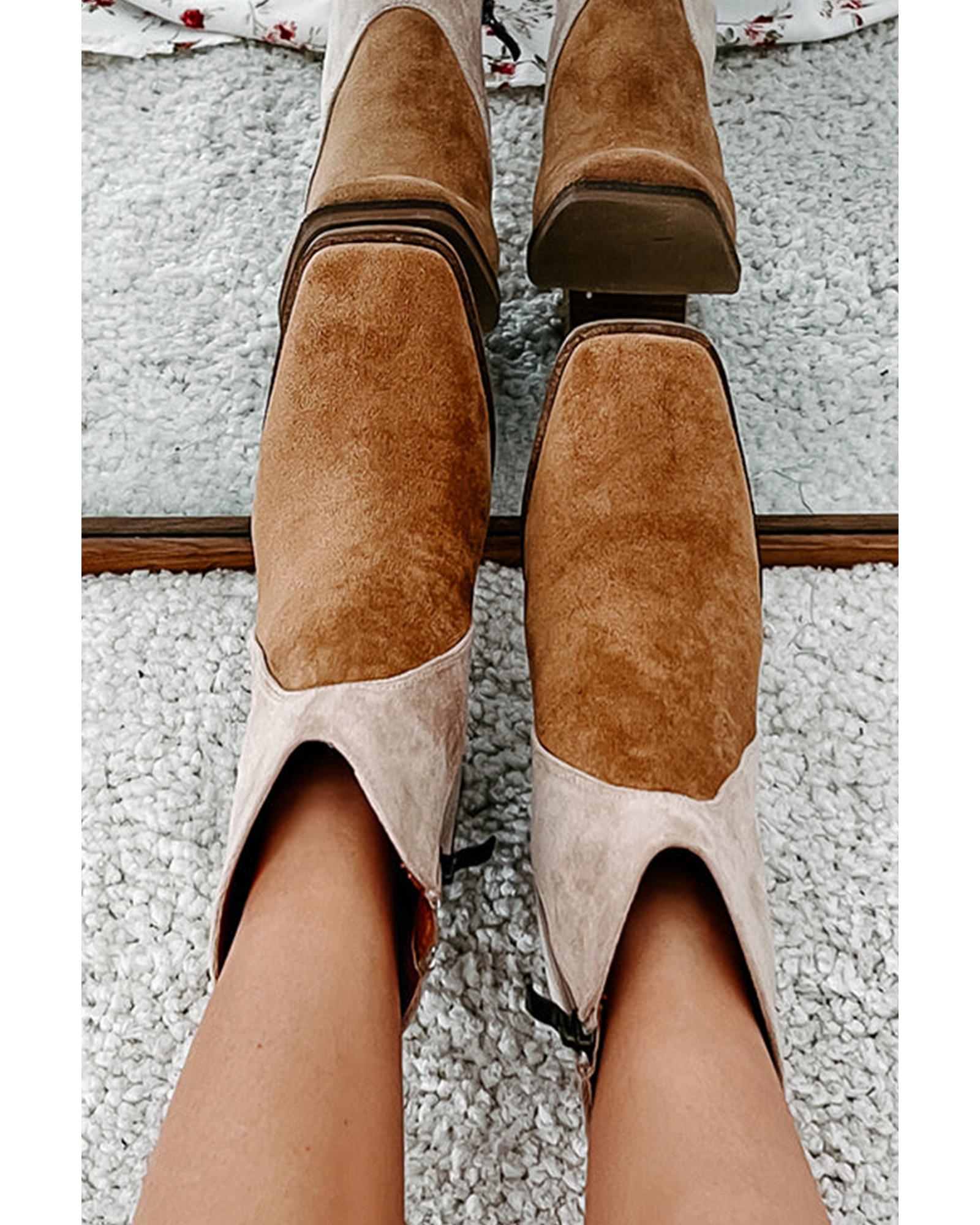 Camel Two Tone Faux Suede Square Toe Chunky Heel Boots - 41 EU
