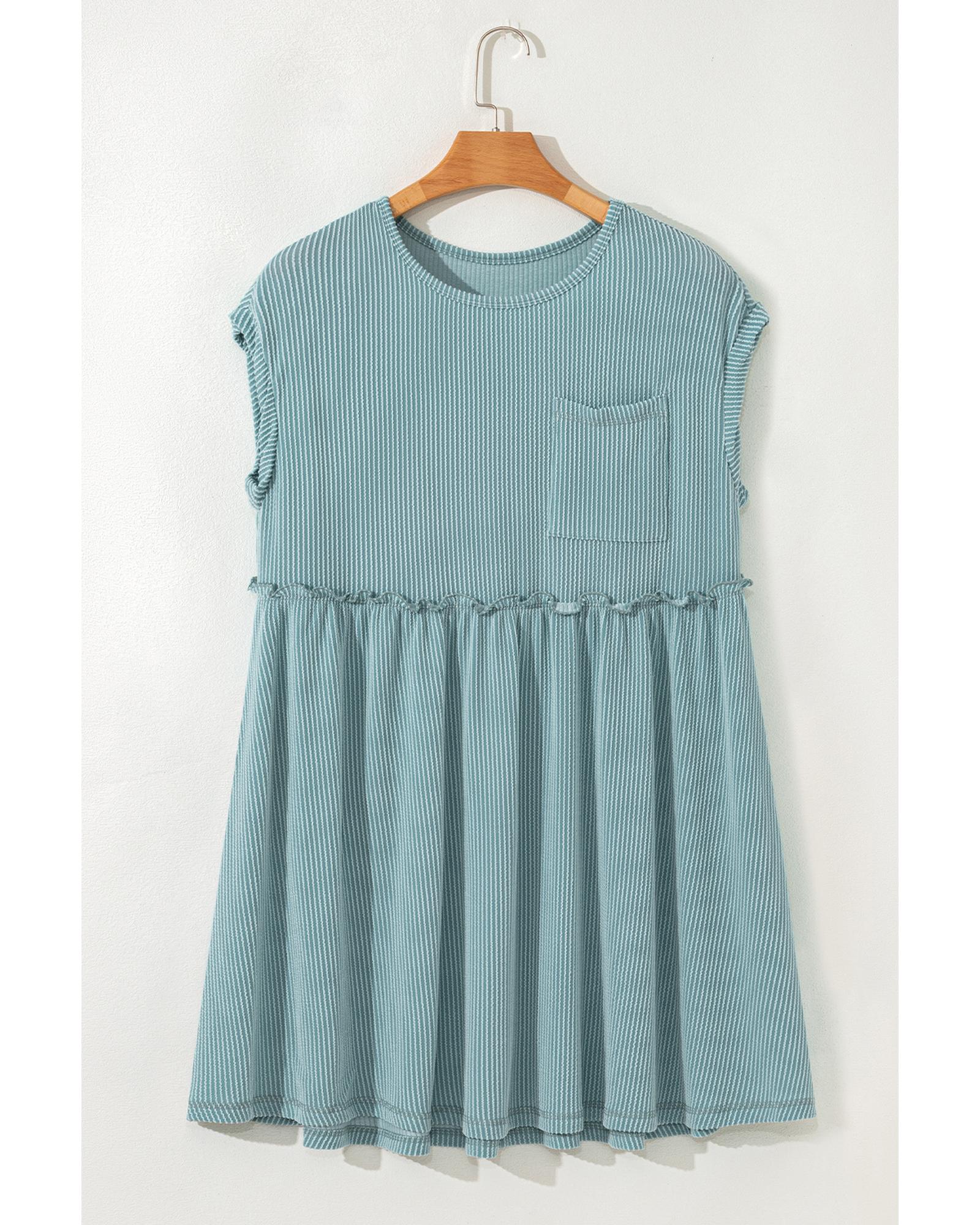 Canton Corded Knit Textured Patched Pocket Frilled Swing Mini Dress with Pockets – M