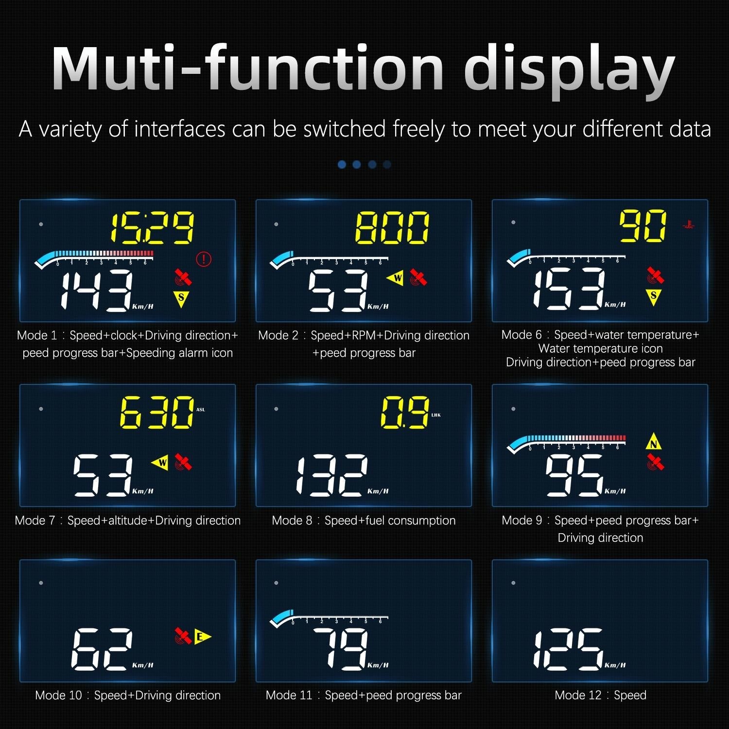 • GPS mode displays vehicle speed, voltage, driving direction, local time, driving time, number of satellites, acceleration to 100 kilometers, altitude, and driving distance