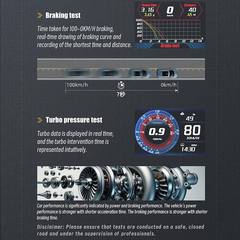 • Professional performance parameters such as acceleration time and braking distance can be obtained without external equipment