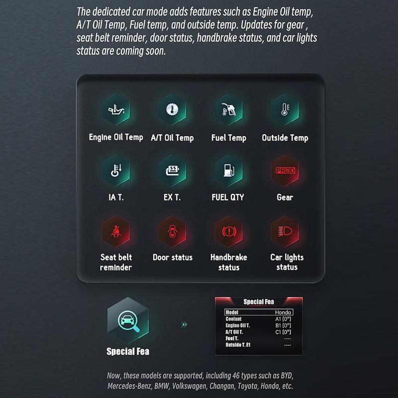 • Special car mode with additional functions such as oil temperature, transmission oil temperature, and vehicle outside temperature