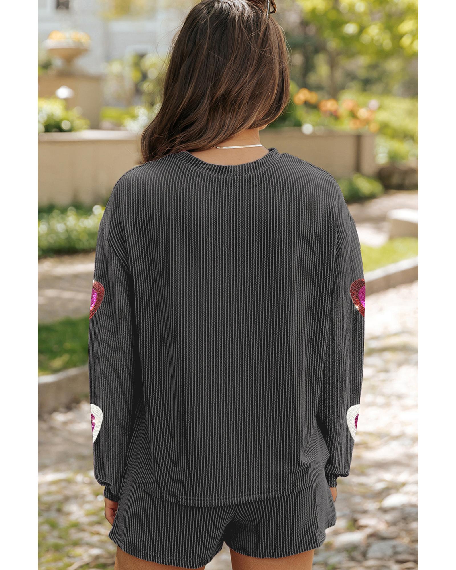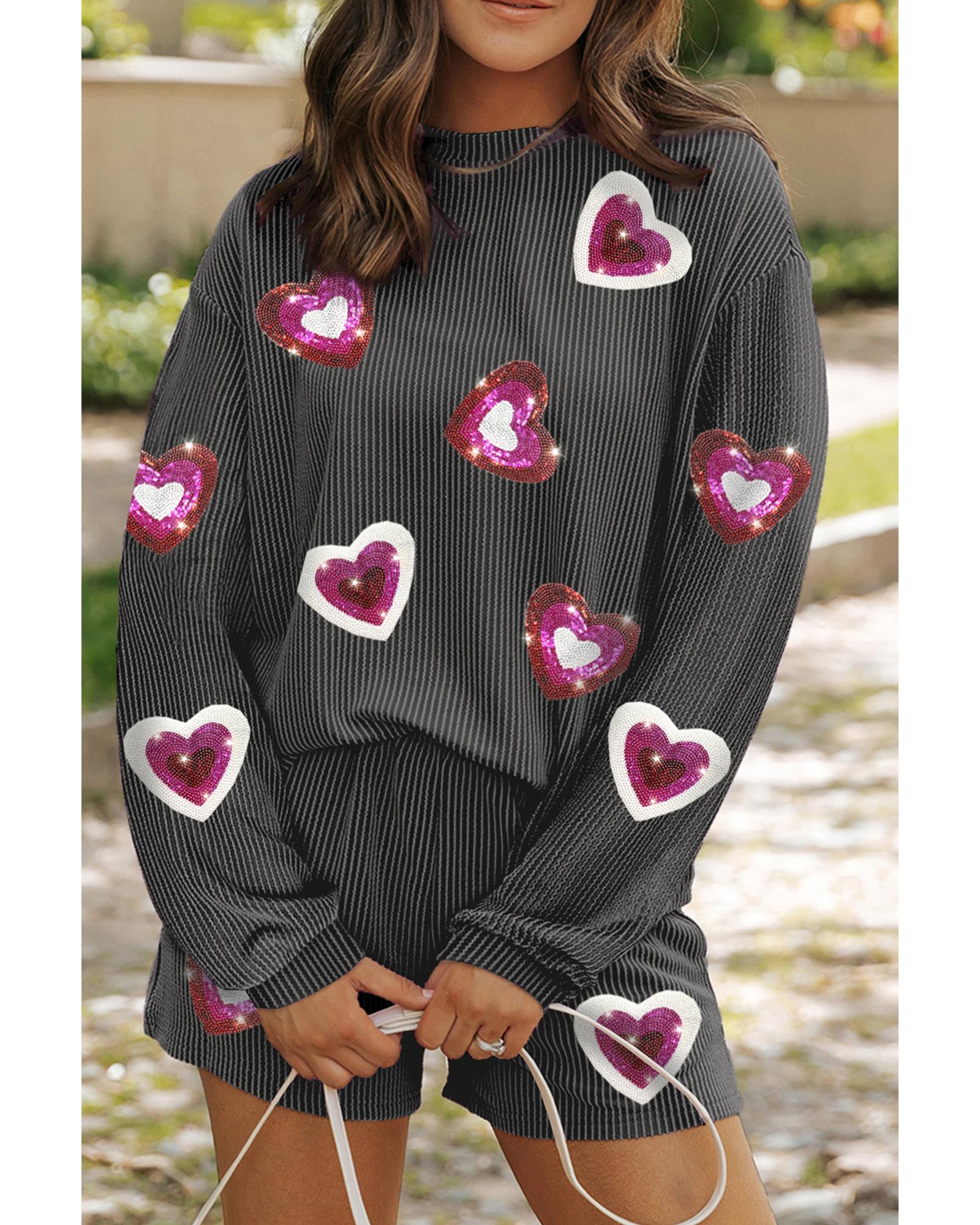 Carbon Grey Valentine Sequin Heart Corded Pullover and Shorts Set – S