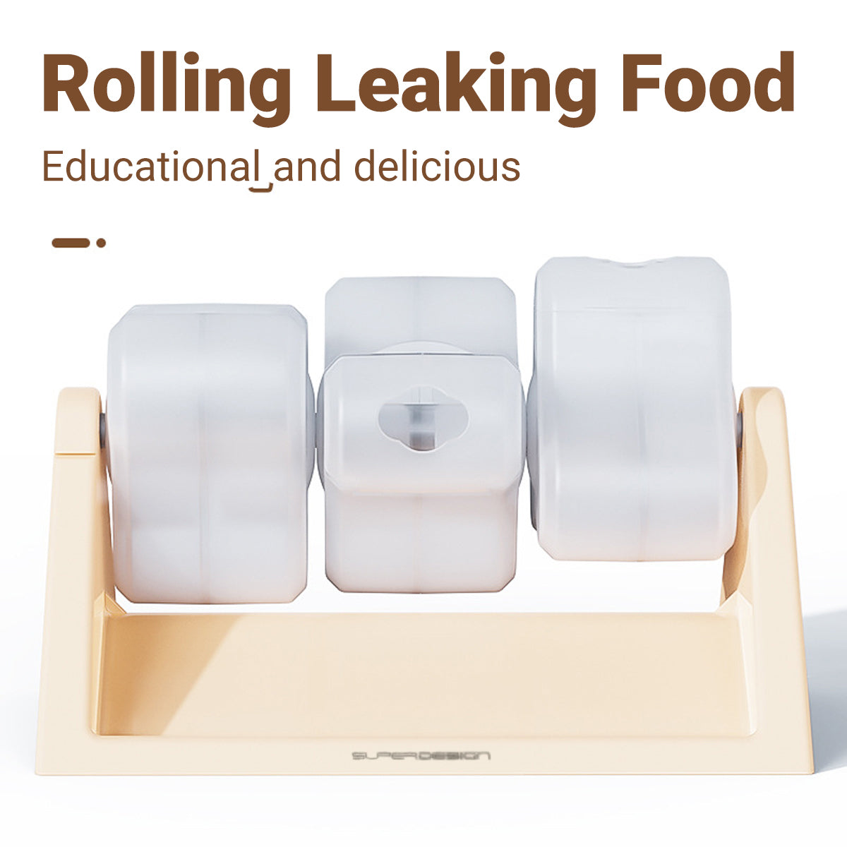 Three rotating barrels with treat holes release snacks with movement