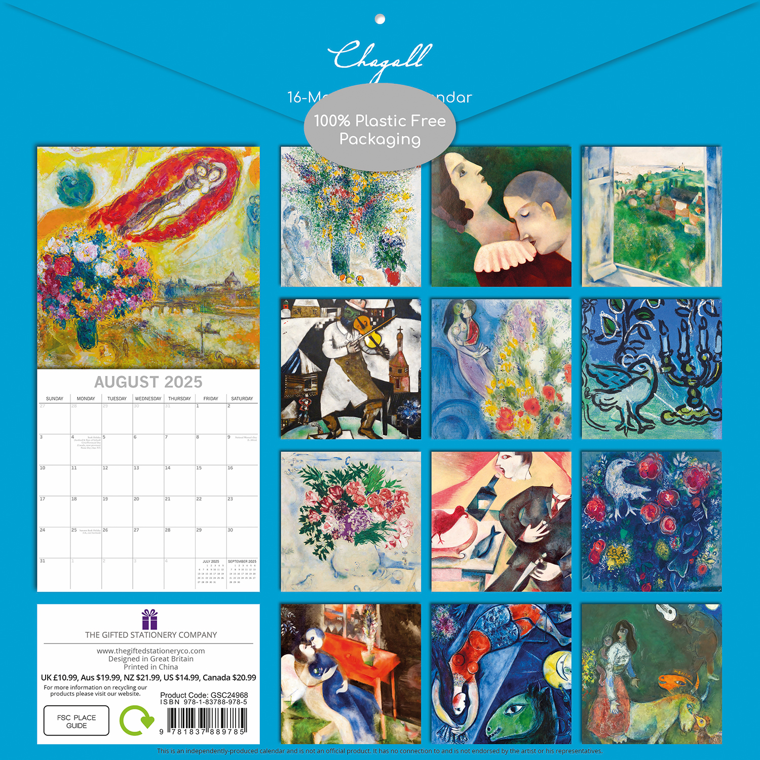 Experience the dreamlike compositions of Marc Chagall in our 2025 calendar. A montage of vivid colors and emotive figures, it’s a window into Chagall’s whimsical world.This beautifully designed, brand-new calendar is both 100% plastic-free and fully recyclable. It comes shrink-wrapped in its original packaging and features: