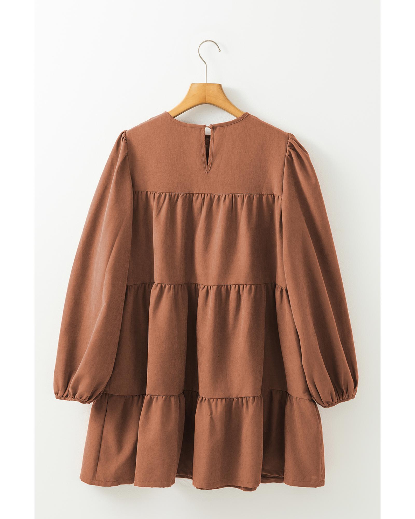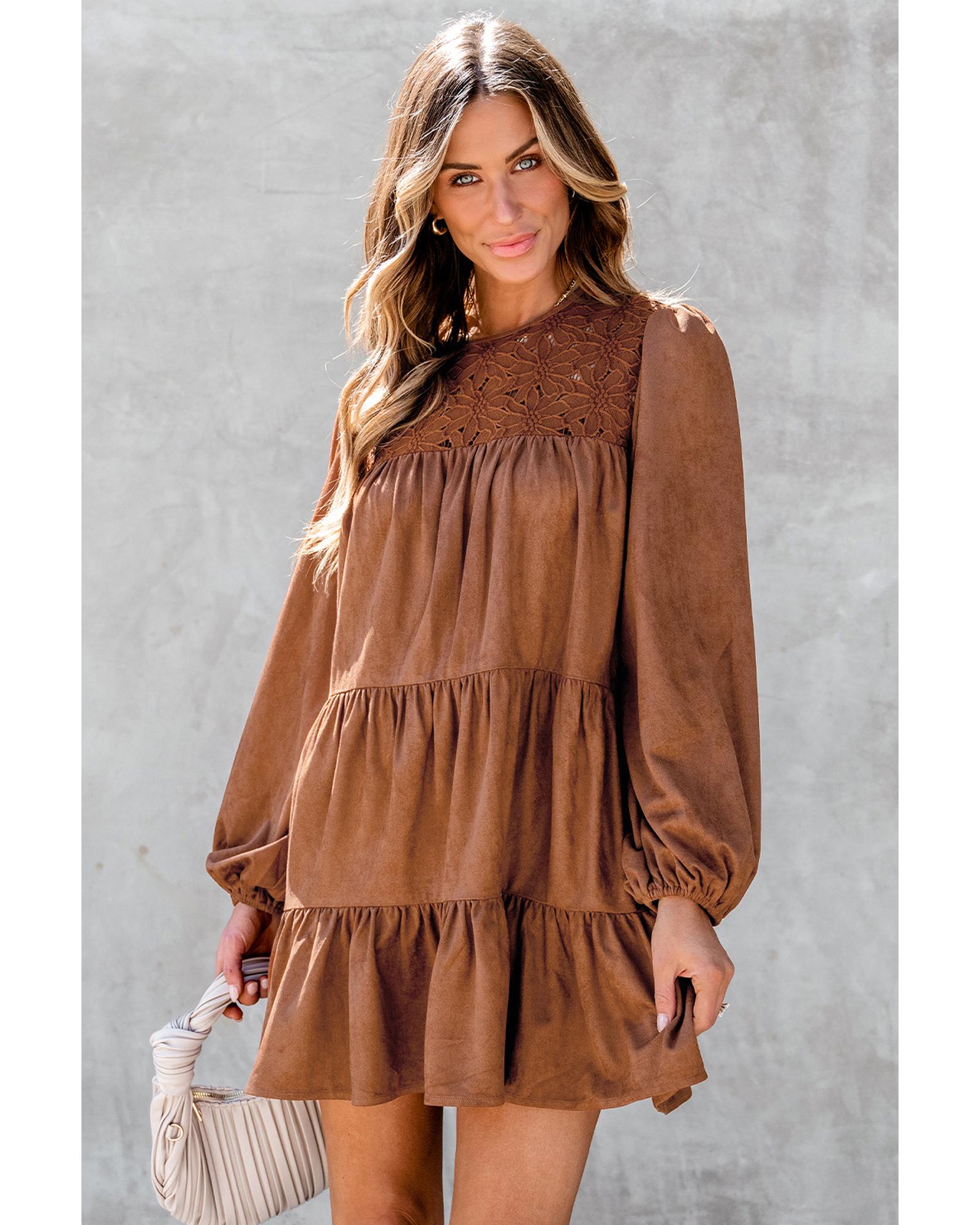 Chestnut Floral Lace Crochet Tiered Ruffled Mini Dress - L