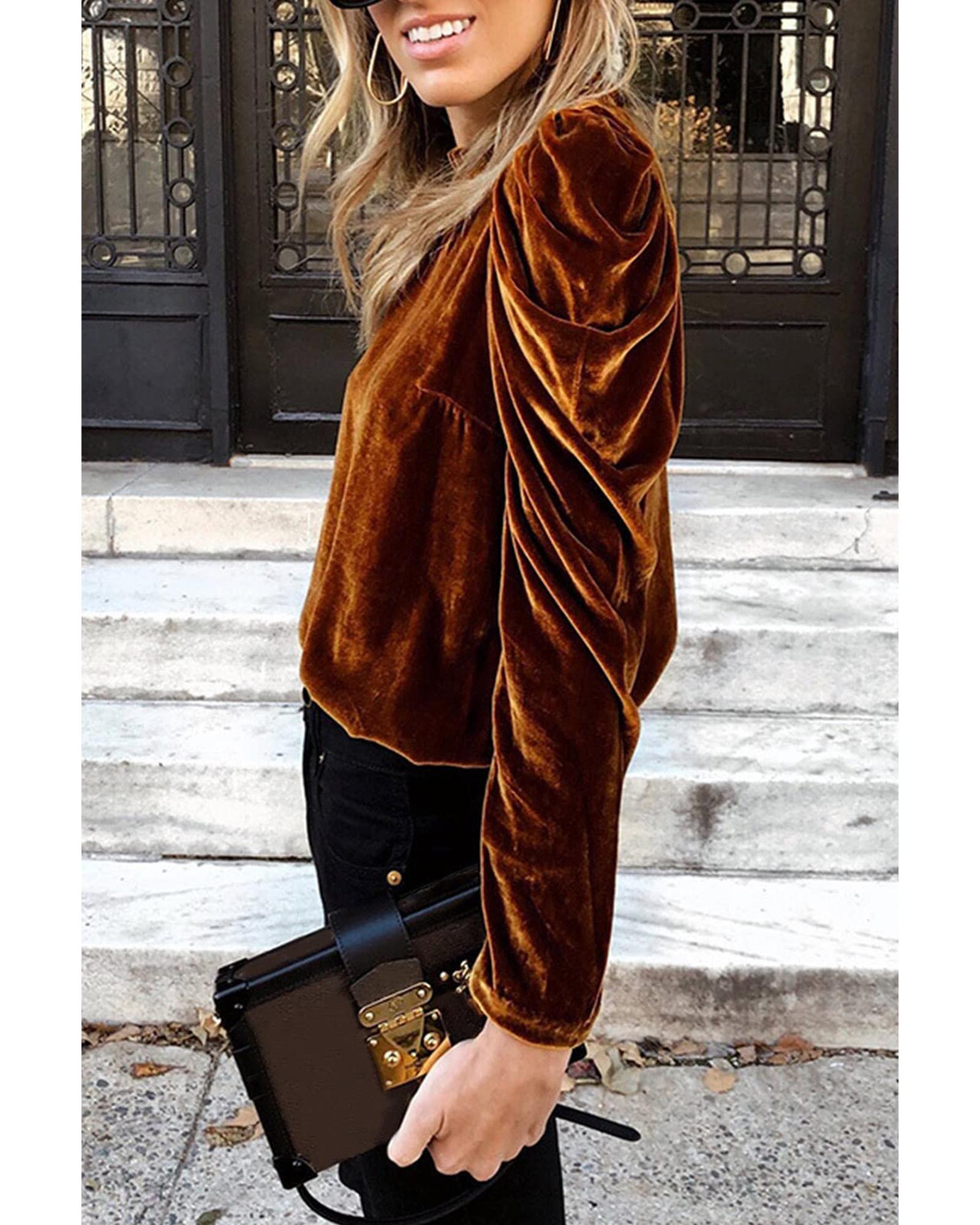 - Luxurious Chestnut Frilled Collar Puff Sleeve Velvet Top