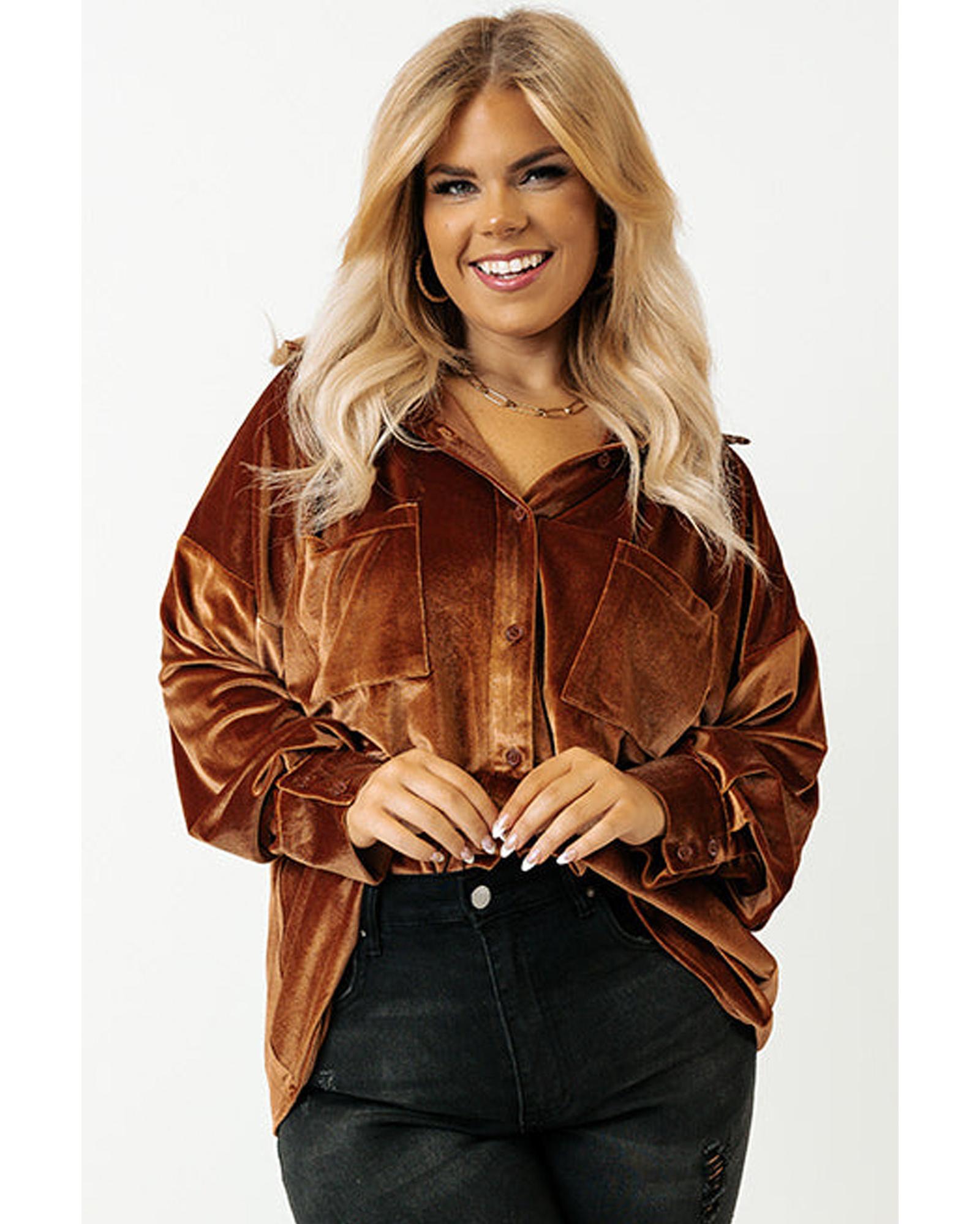 Chestnut Plus Size Velvet Chest Pocket Drop Shoulder Shirt – 4X