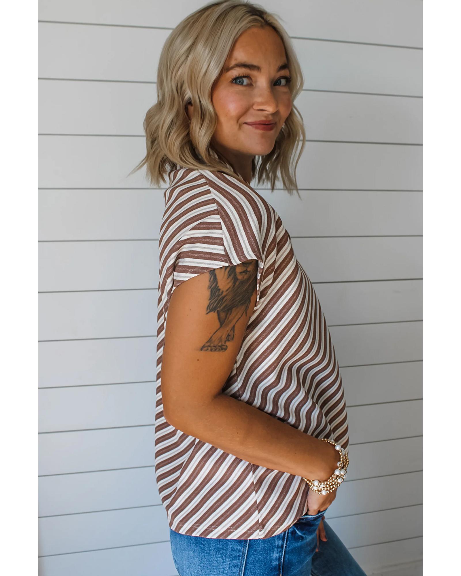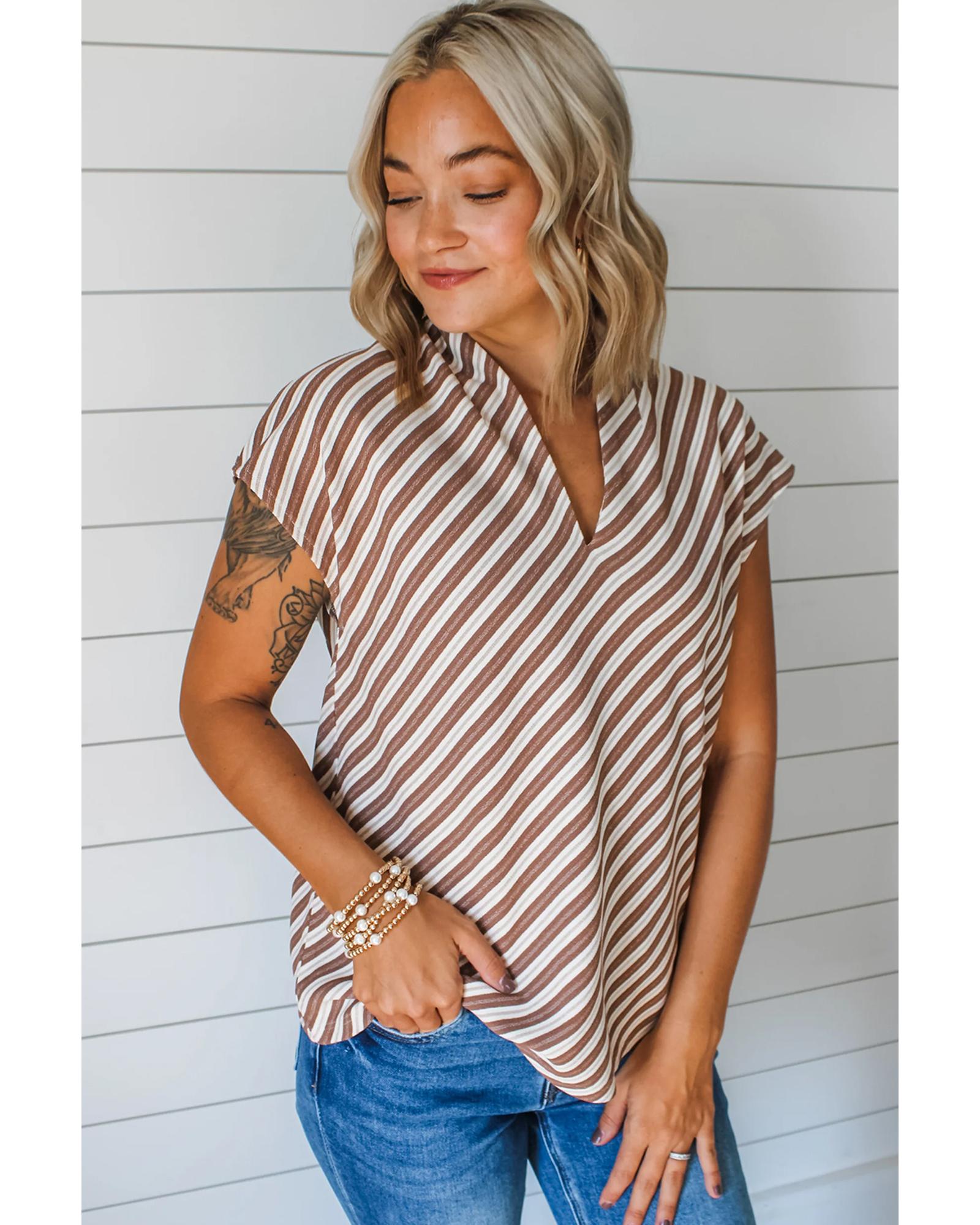Chestnut Striped Stand V Neck Short Sleeve Blouse – S