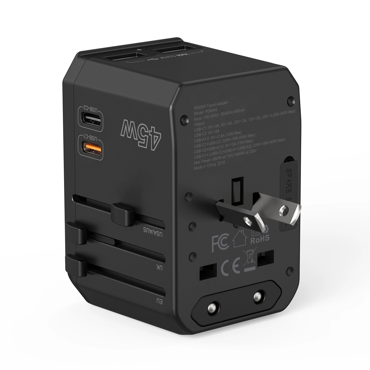 The Choetech PD6045 wall charger features 2 USB-C ports and 2 USB-A ports, allowing you to charge up to 4 devices simultaneously. With up to 45W power output and GaN technology, it delivers fast, efficient charging in a compact design. Its interchangeable plugs support US, EU, UK, and AU standards, making it ideal for travel.