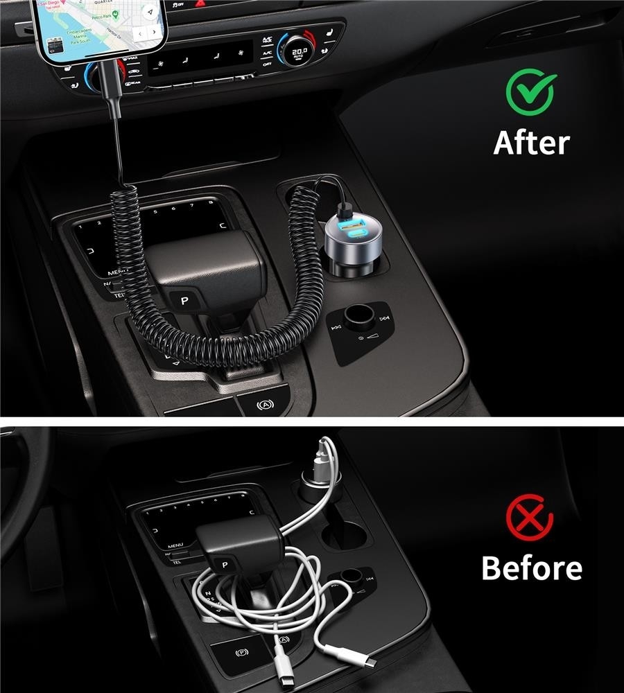 CHOETECH TC0030 65W 3-Port Fast Car Charger with 3.3ft Type-C Stretchable Cable