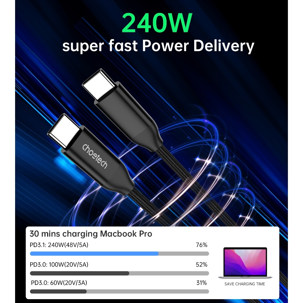 With support for the PD3.1 fast charging protocol and an impressive 240W capacity, the Choetech cable ensures swift charging for various devices like smartphones and laptops.