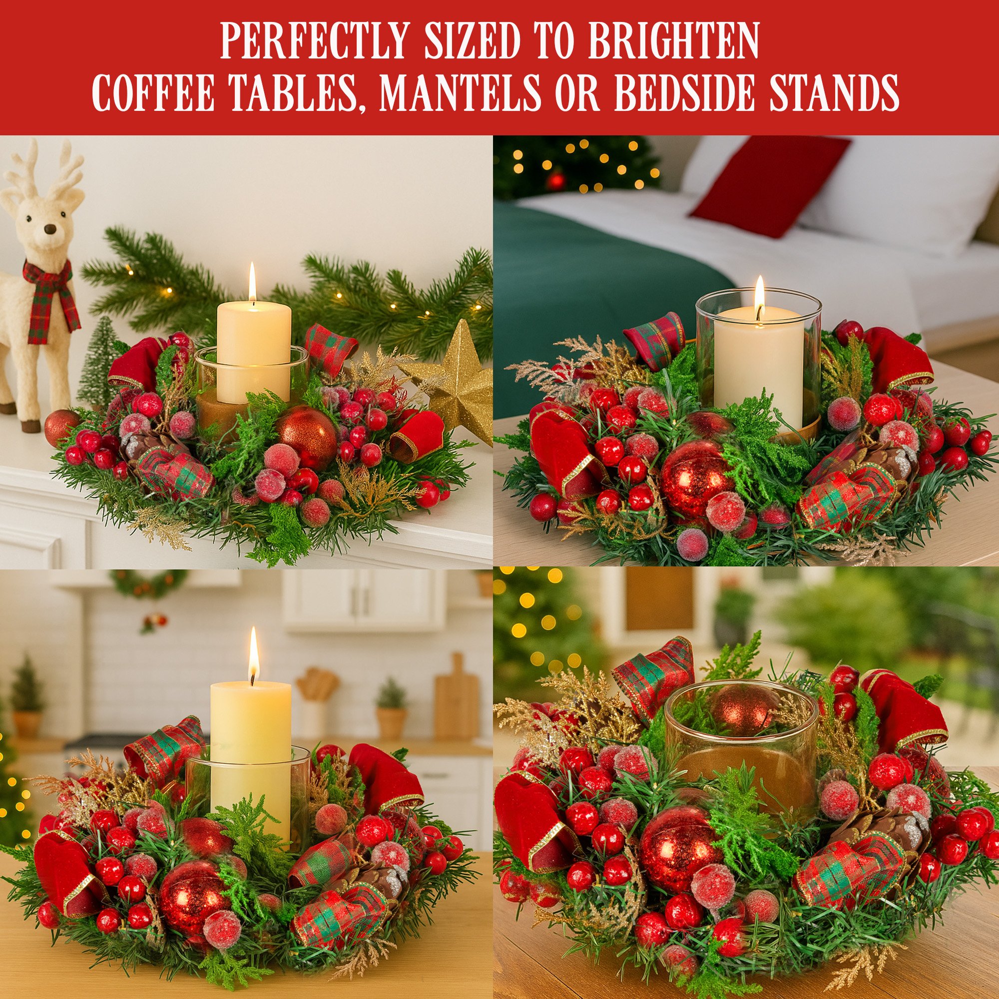 Christabelle 26cm Christmas Centrepiece Lush Green Holiday Display w/Red Berries & Hurricane Candle Holder Pre-decorated for Dining Table Console
