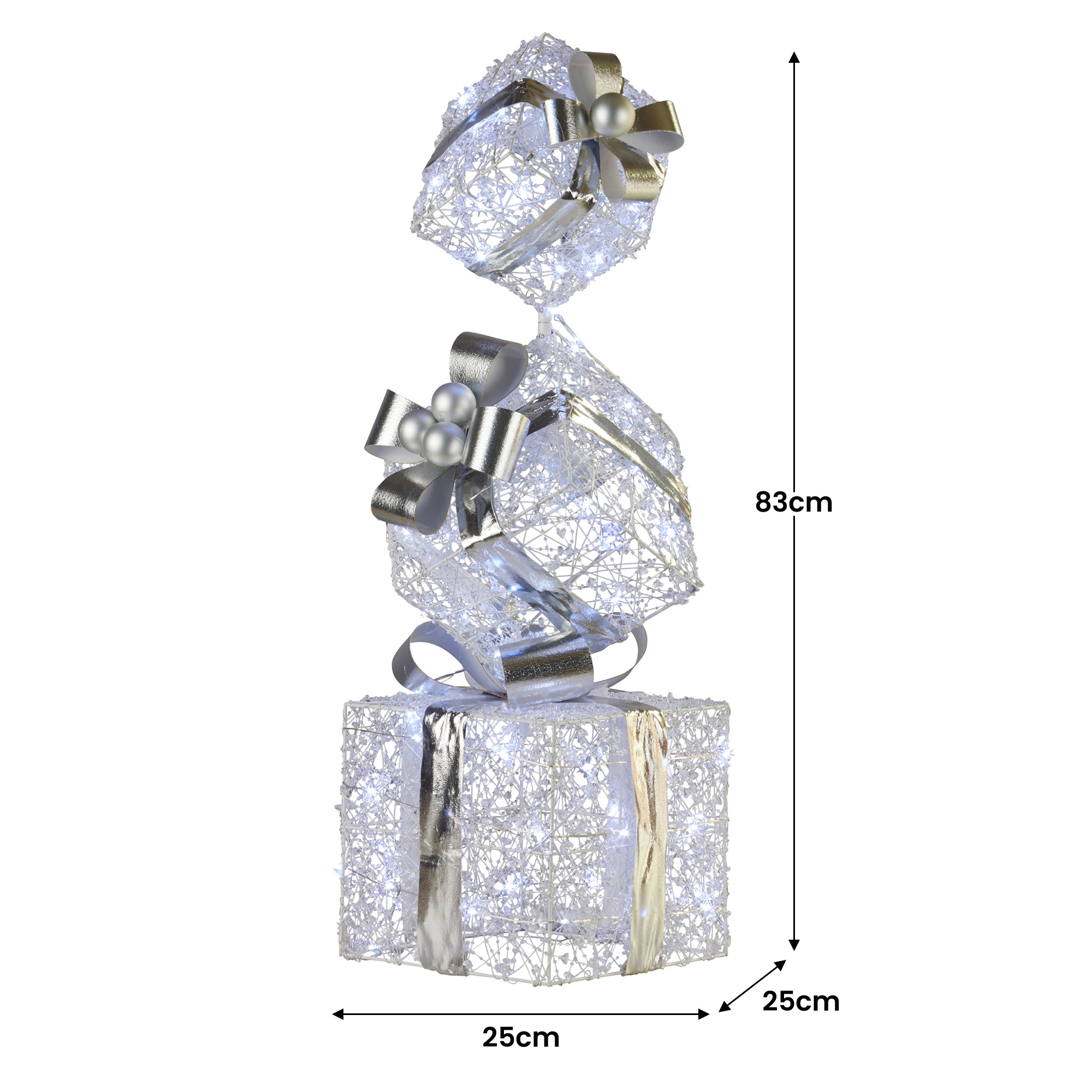 Bring the brilliant shine of this gorgeous triple Christmas gift box stack display to your holiday setup! Its decked out in a silver colour scheme, cool white LED lights and eye-catching pearl string wire. Each box is topped off with stunning silver bows for that extra touch of elegance. This gift stack display will definitely add a magical and festive vibe to your celebrations!
