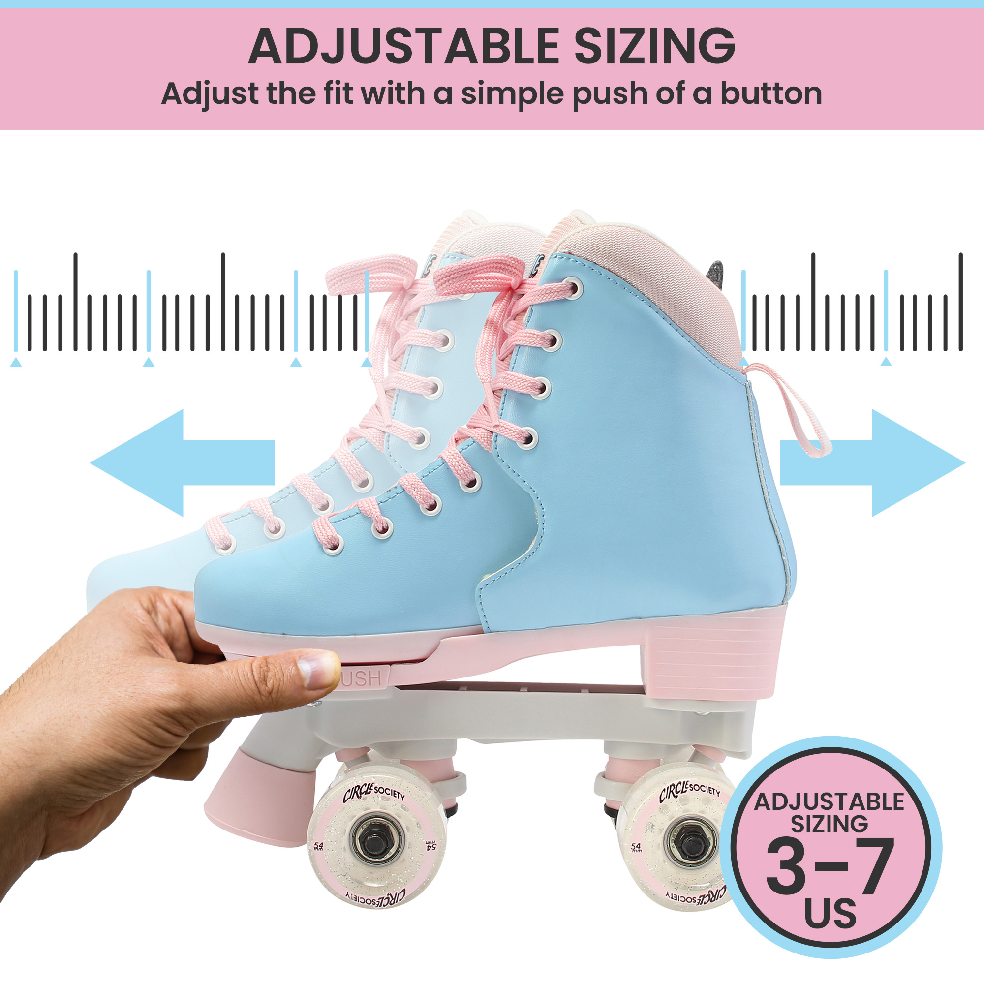 Skate through the streets with great flair sporting Circle Societys Adjustable Roller Skates! Featuring a vibrant design and smooth-rolling polyurethane wheels, these skates are perfect for indoor and outdoor adventures. With an easy-push button for adjustable sizing (US sizes 3-7) and ABEC 7 sealed bearings, youll be grooving down the rink with a snug fit and reliable performance. Plus, dual front brakes ensure safety and control during every ride. So whatre you waiting for? Strap on and let the good times roll!