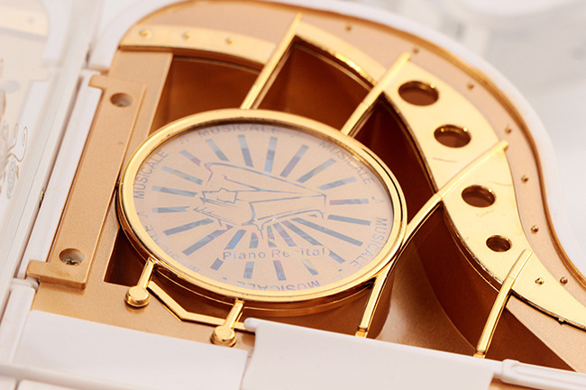 - Clear Viewing Panel: The prop-up lid has a transparent panel, allowing a glimpse of the musical mechanism and the “Piano Recital MUSICALE” detail.