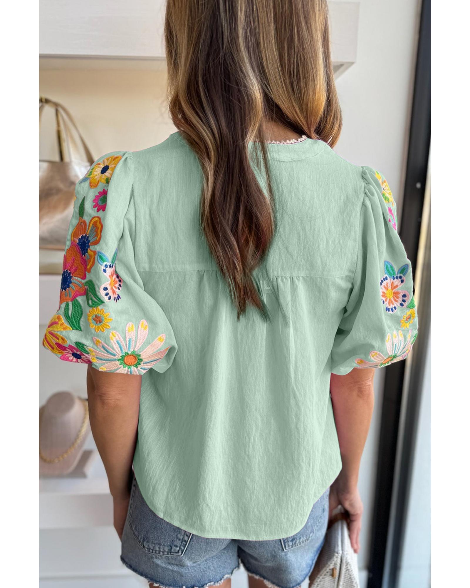 Clearly Aqua Floral Embroidered Puff Sleeve Split Neck Blouse – M