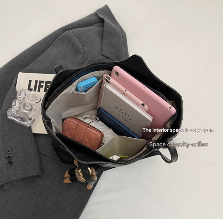 Elevate your everyday style with this chic black tote bag. Made from high-quality PU leather and featuring a cute bear keychain, this bag is both practical and fashionable, making it an excellent accessory for work, shopping, or casual outings.
