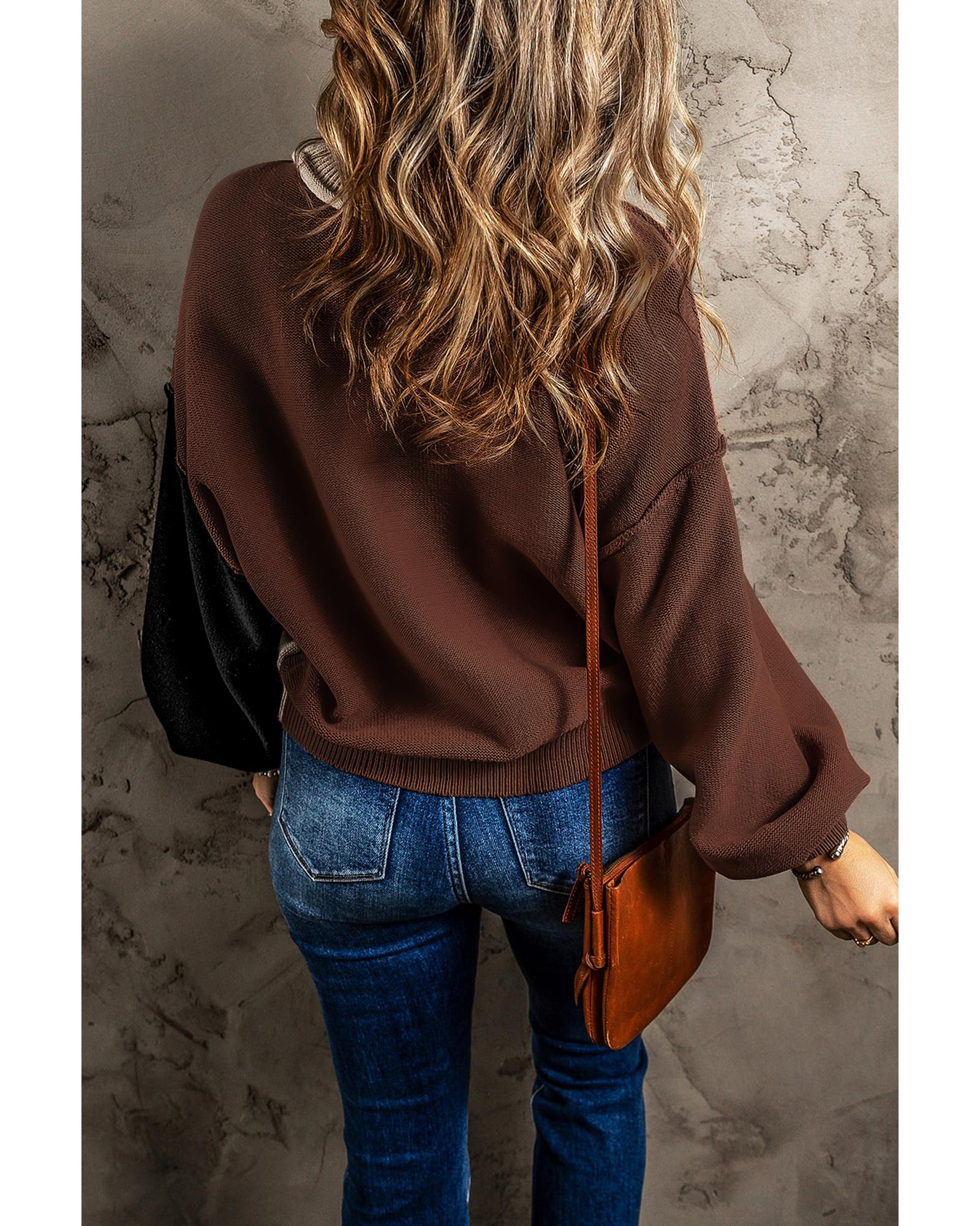 Coffee Colorblock Bishop Sleeve Ribbed Trim Sweater – L