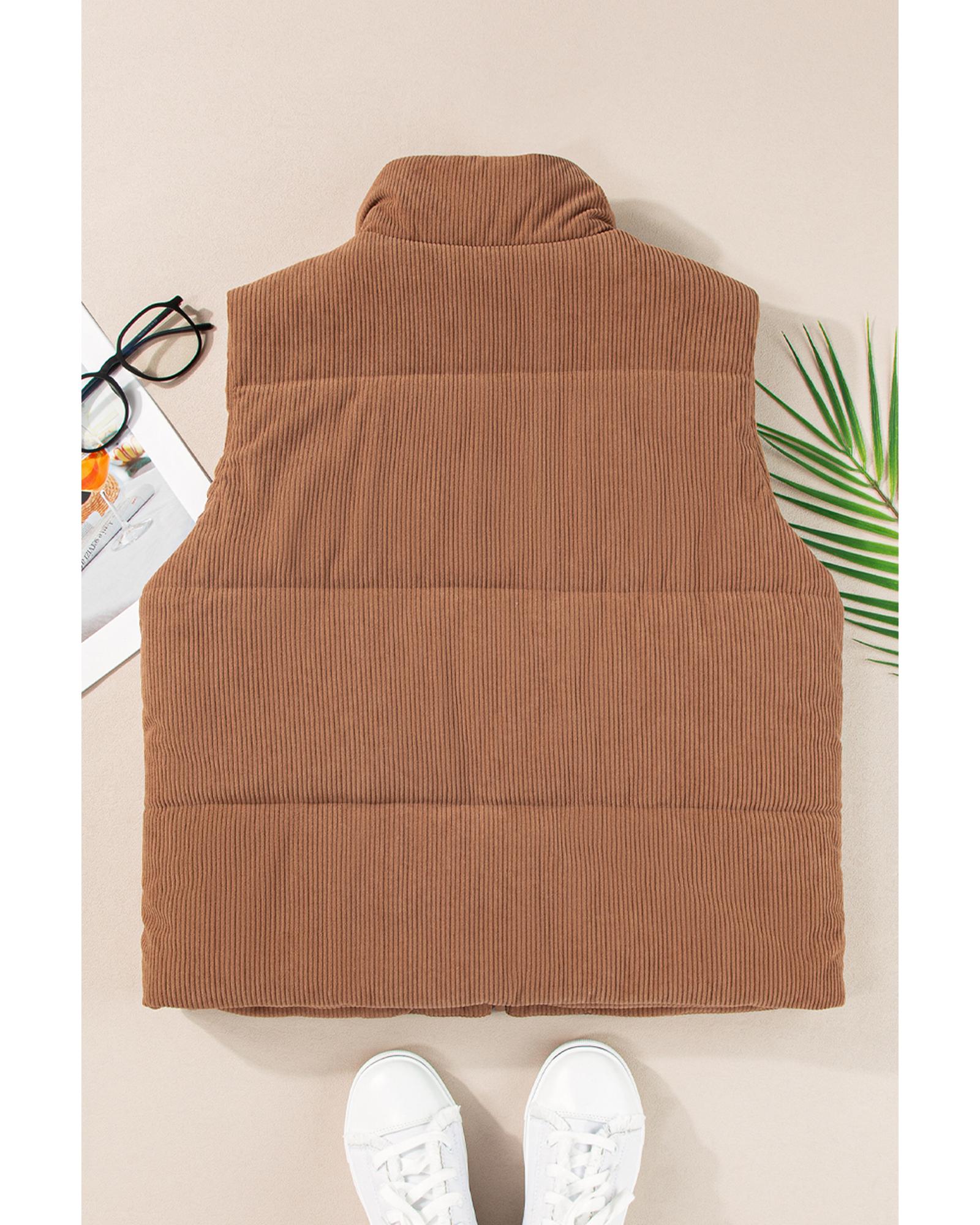 Coffee Corduroy Stand Neck Zipped Puffer Vest – S