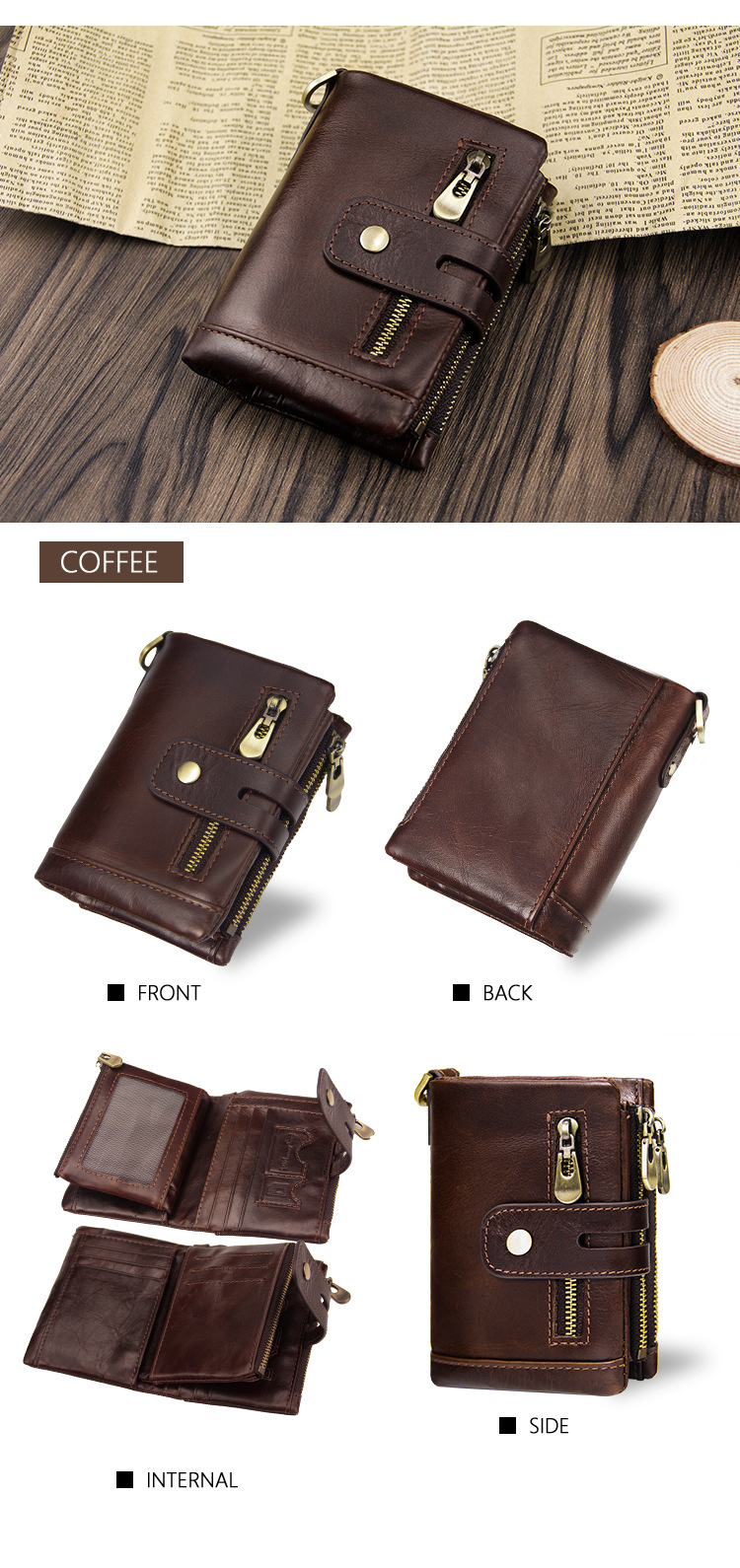 - Spacious Design: Equipped with 2 banknote compartments and a secure zippered coin pocket for organized storage.