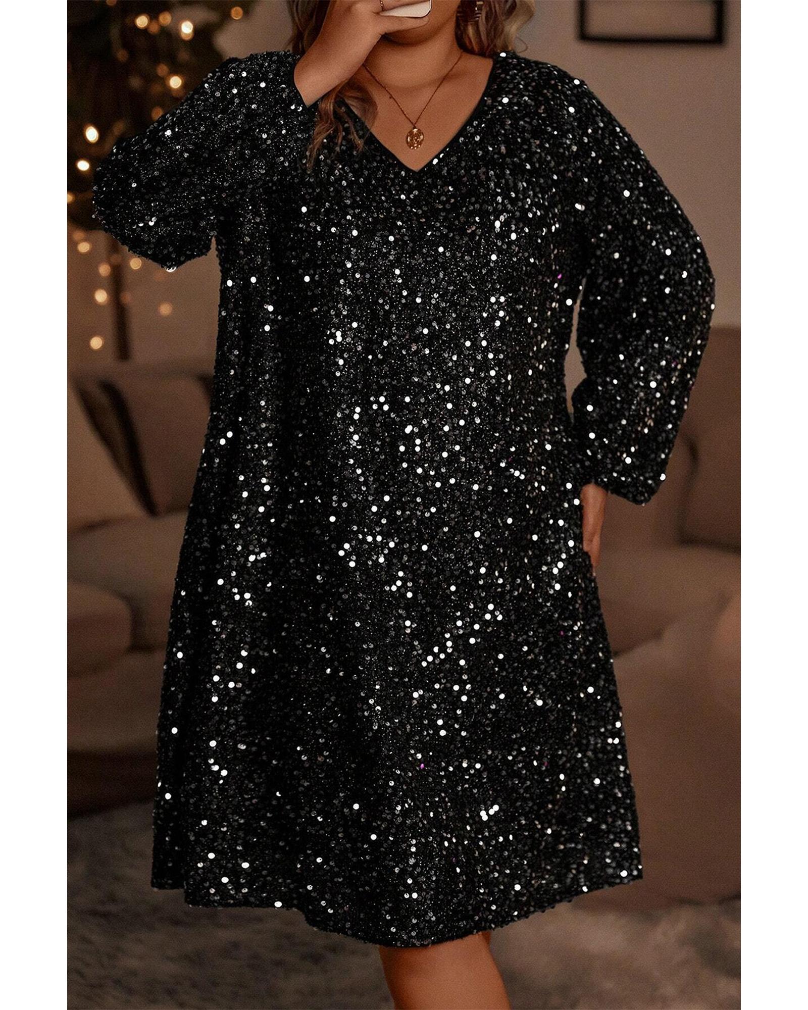 Color black Plus Size Bubble Sleeve V Neck Sequin Dress – 3X