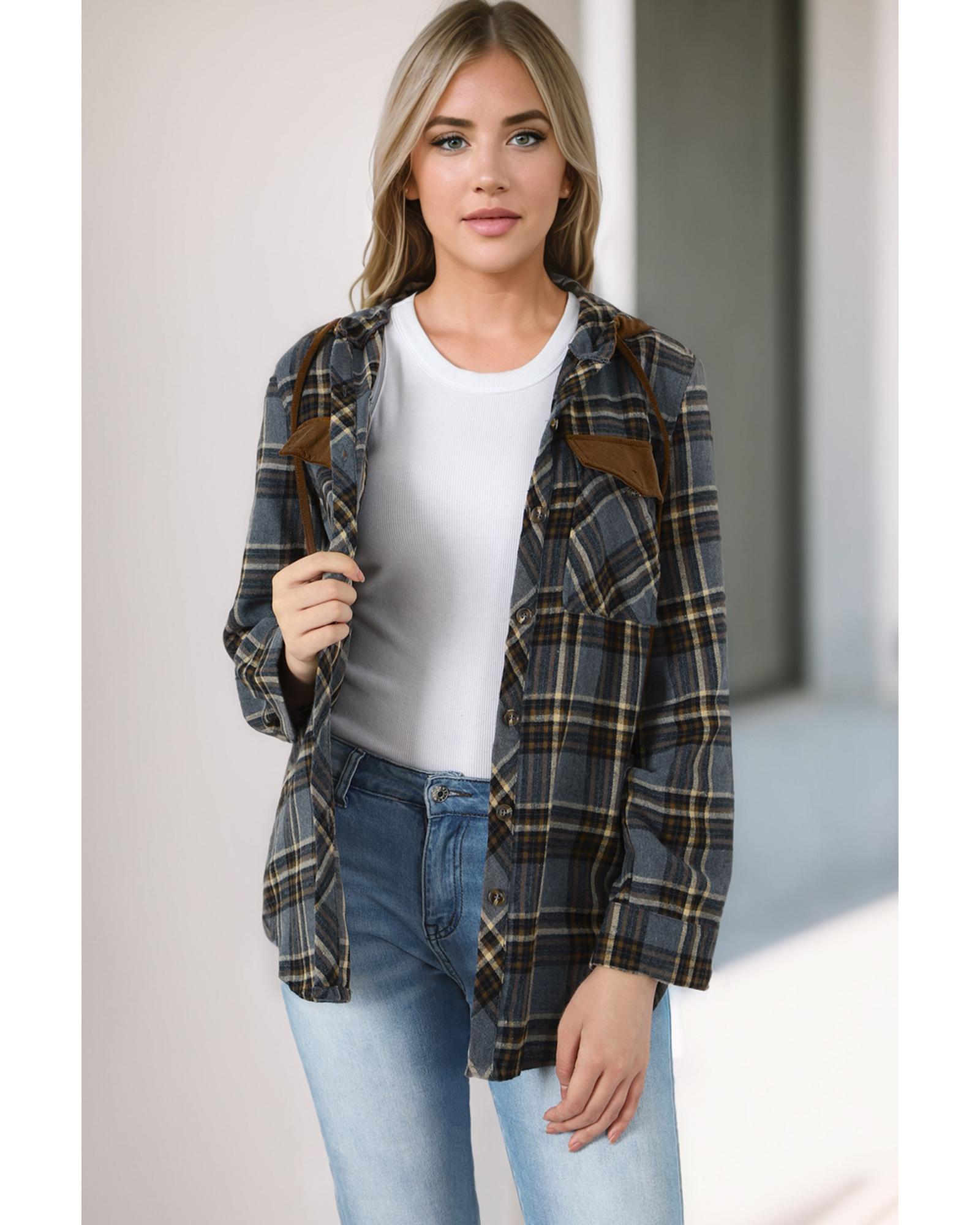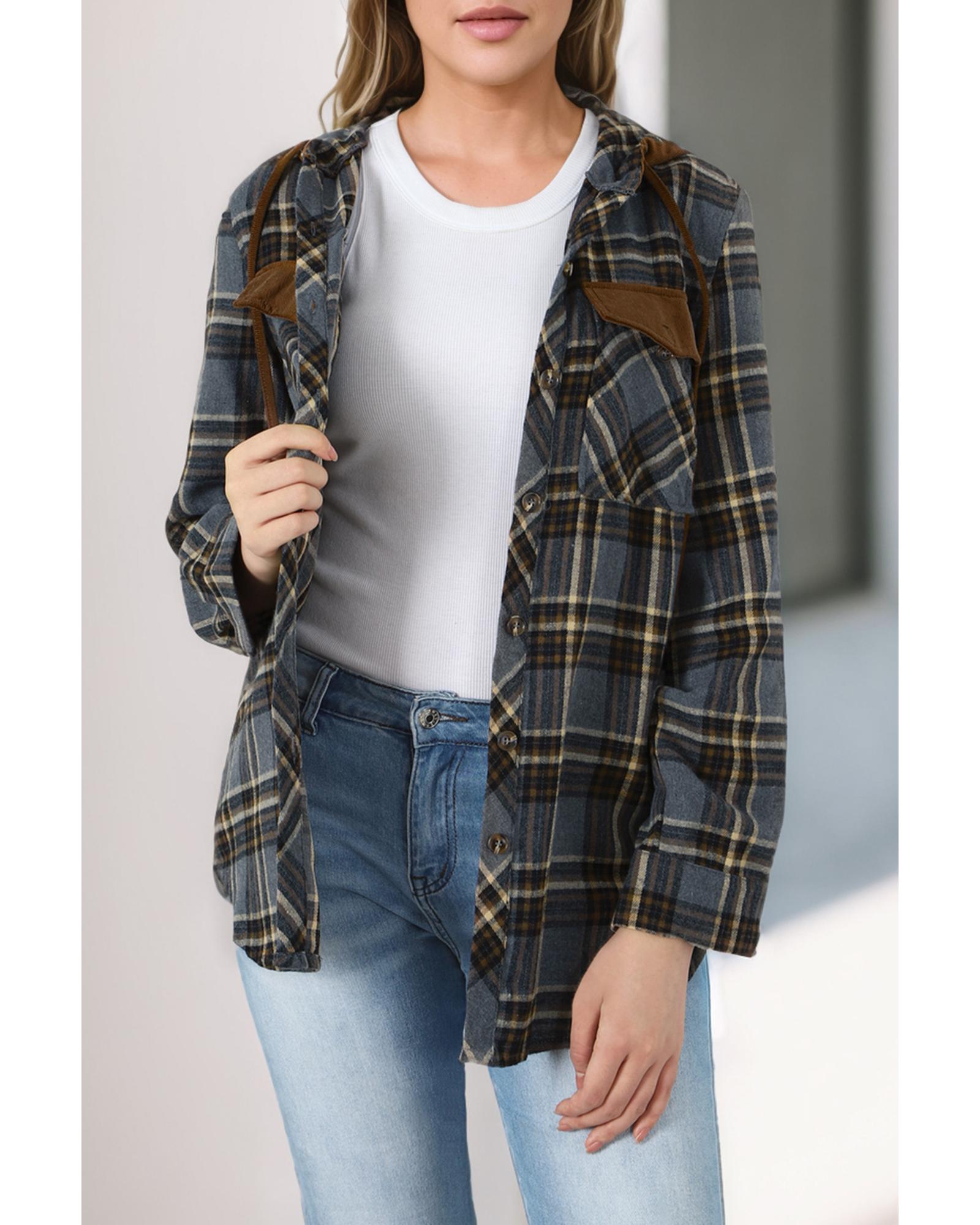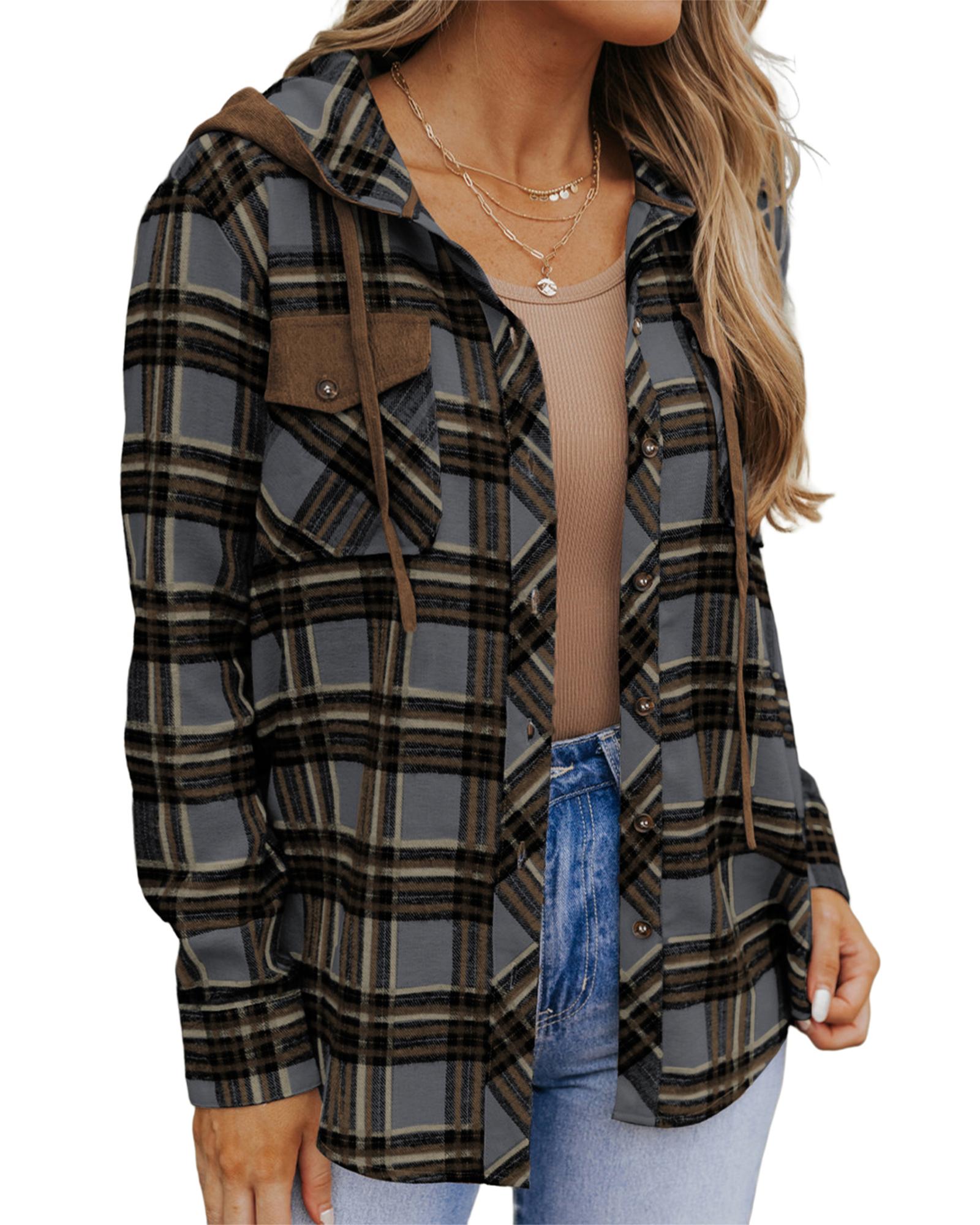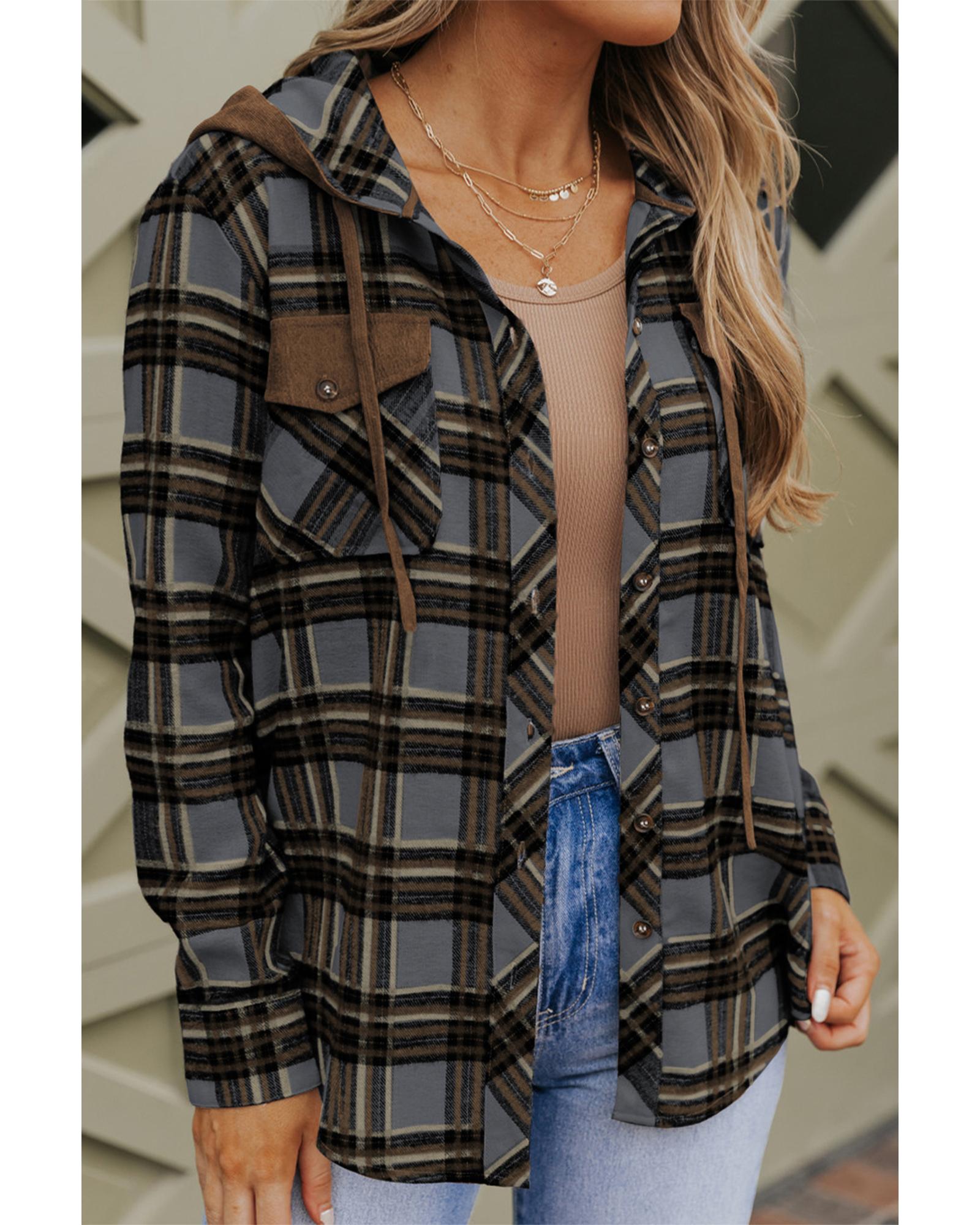 Contrast Hooded Drawstring Plaid Shacket – M