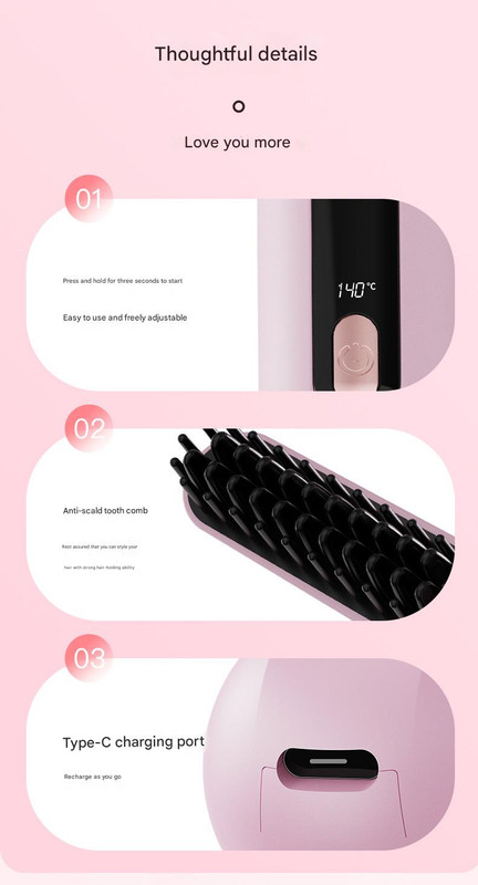 Achieve sleek, straight hair anytime, anywhere with our innovative Cordless Hair Straightener Brush. This portable styling tool is designed for ultimate convenience, featuring a powerful 4000mAh battery and fast USB Type-C charging. With its 3D anti-scald comb design, incorporating an outer layer of smoothing comb teeth and an inner layer of U-shaped heating elements, it provides strong hair gripping capabilities while ensuring safe styling. The brush heats up in just 30 seconds with PTC constant temperature technology for hair care, and offers 4 adjustable temperature settings (140C, 160C, 180C, 200C) to suit various hair types. Its compact design with a protective cap makes it easy to carry in your bag for quick touch-ups. Enjoy the freedom of wireless styling with this easy-to-use, long-press 3-second start hair straightening comb.