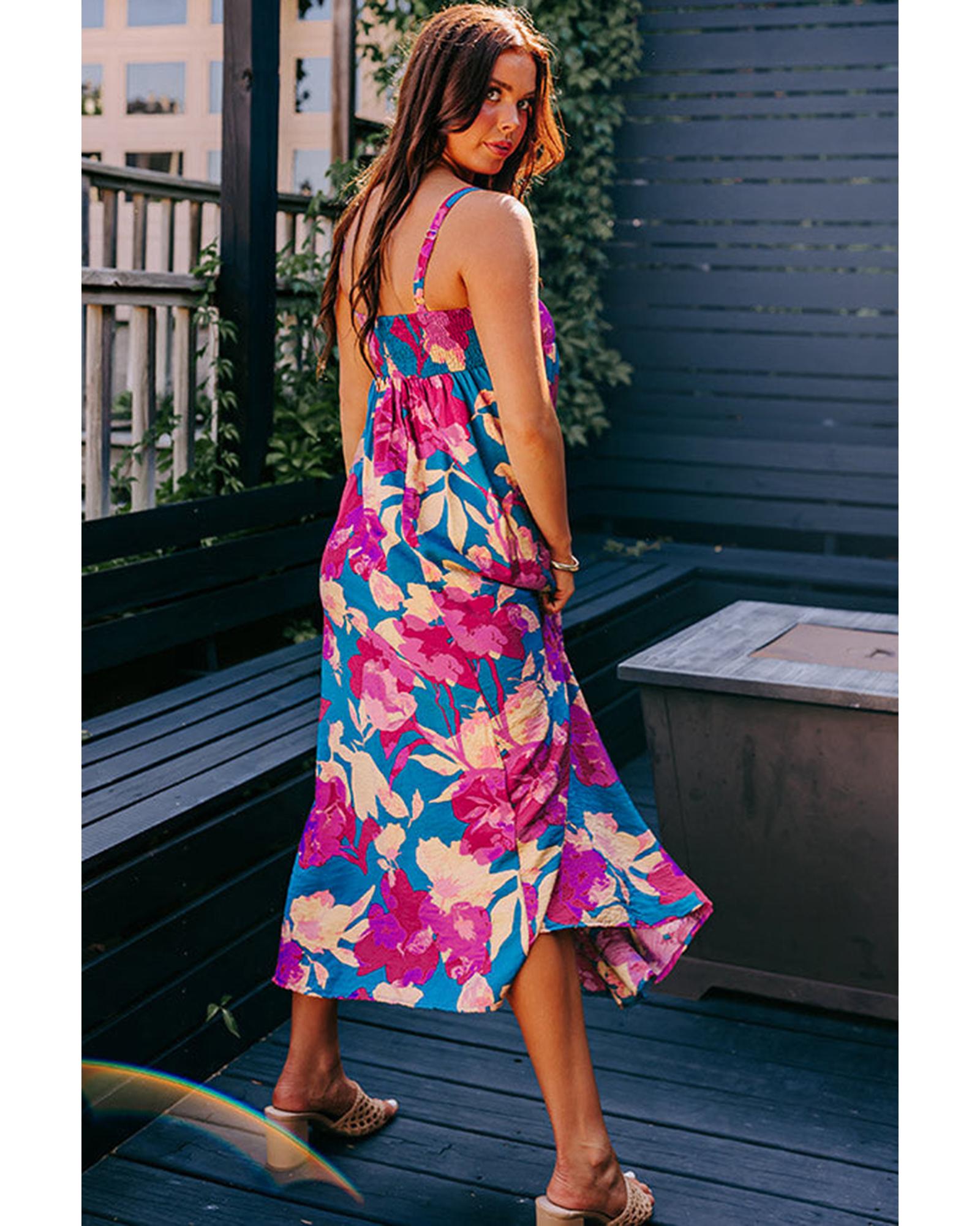 Dark Blue Floral High Waist Sleeveless Flared Long Dress - M