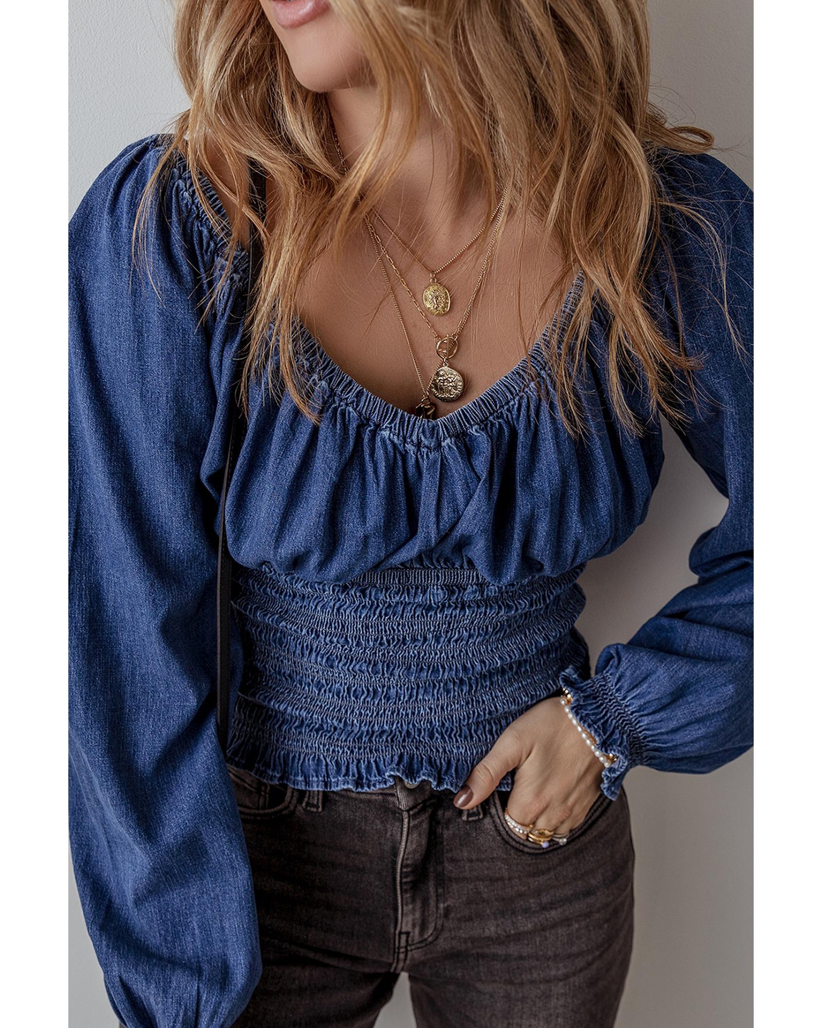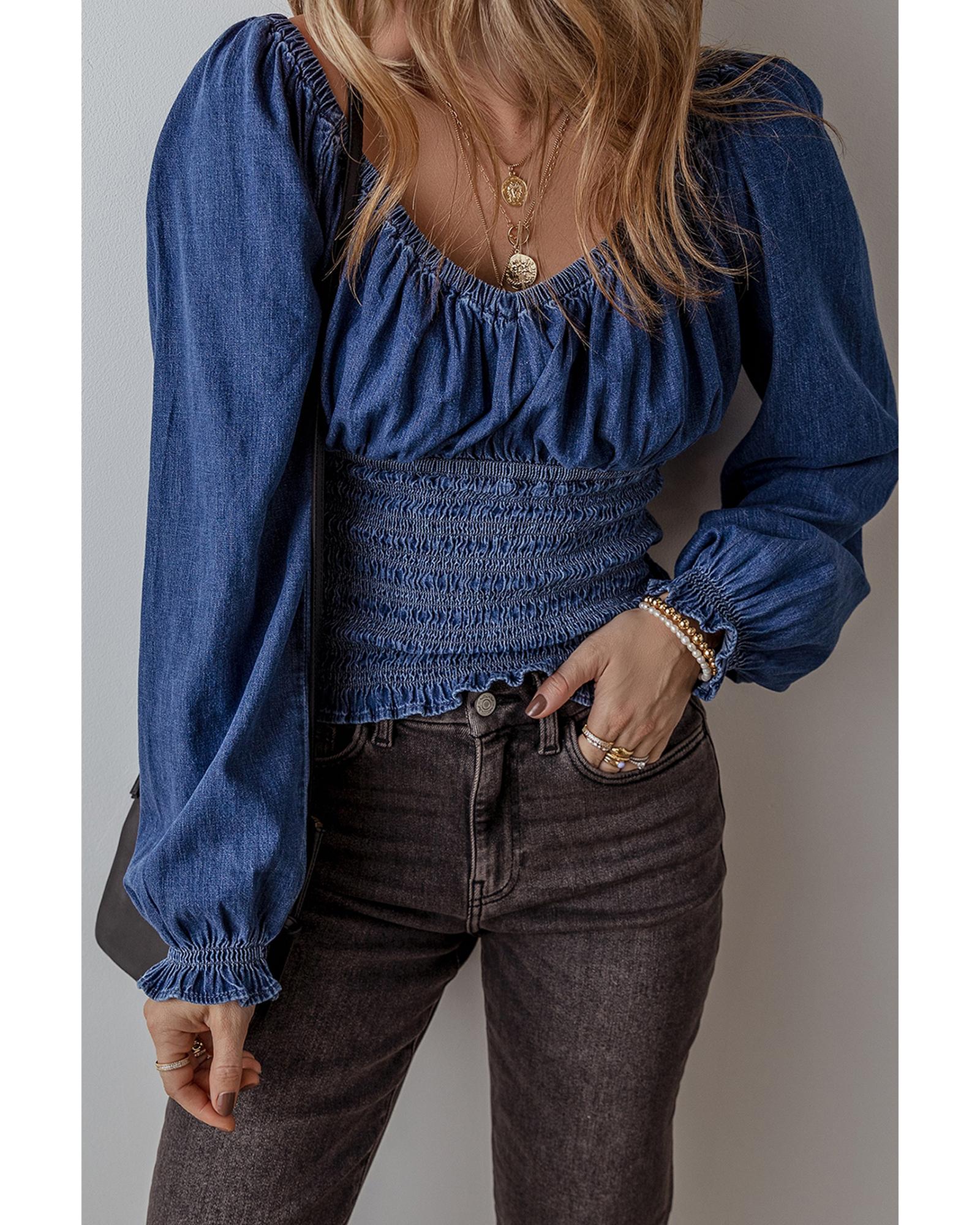 Dark Blue Smocked Ruffled Puff Sleeve V Neck Denim Blouse – M