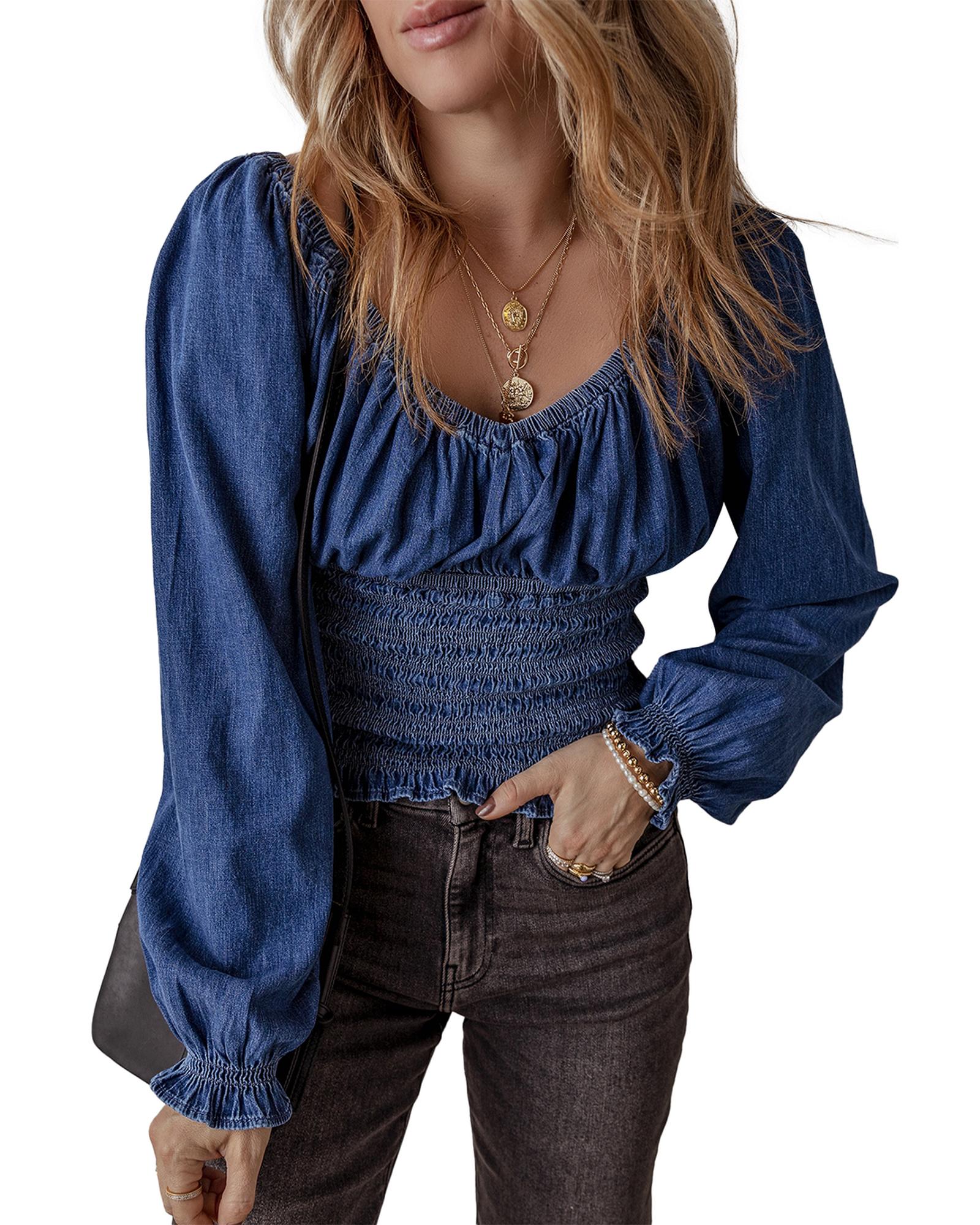 Dark Blue Smocked Ruffled Puff Sleeve V Neck Denim Blouse – S
