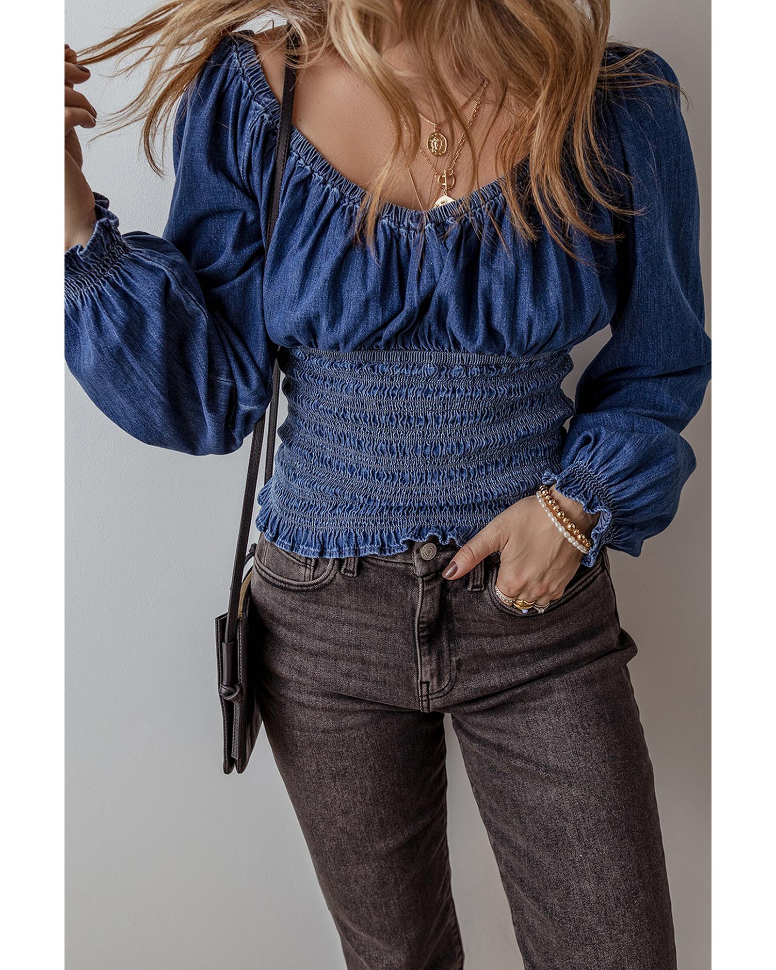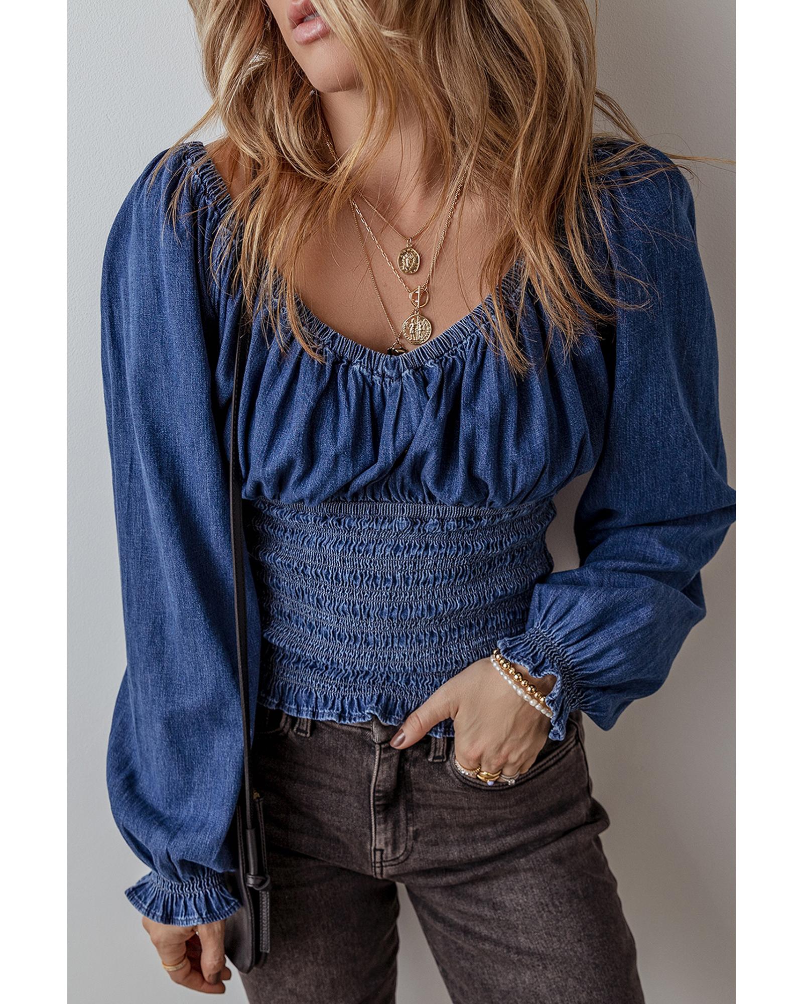 Dark Blue Smocked Ruffled Puff Sleeve V Neck Denim Blouse – XL