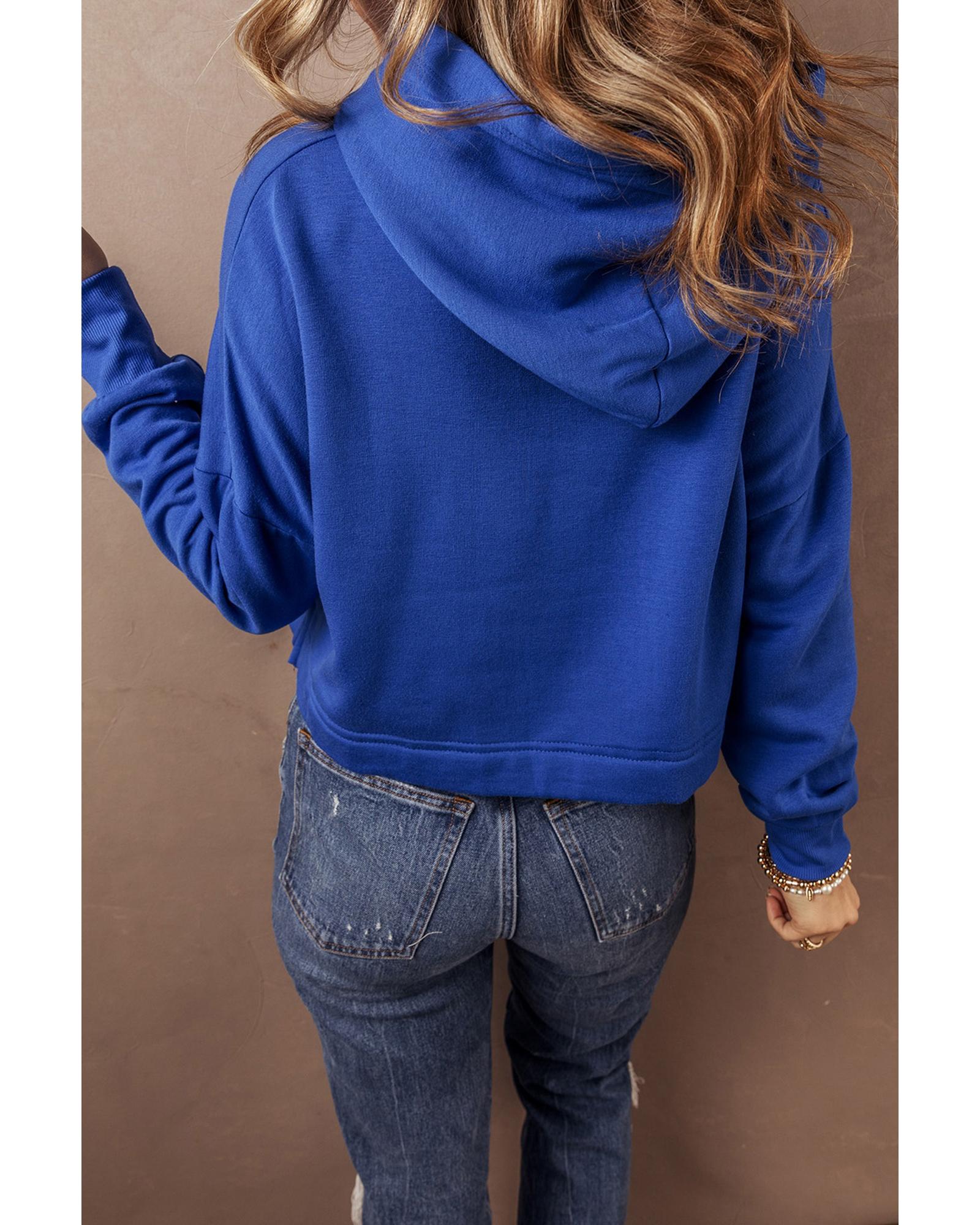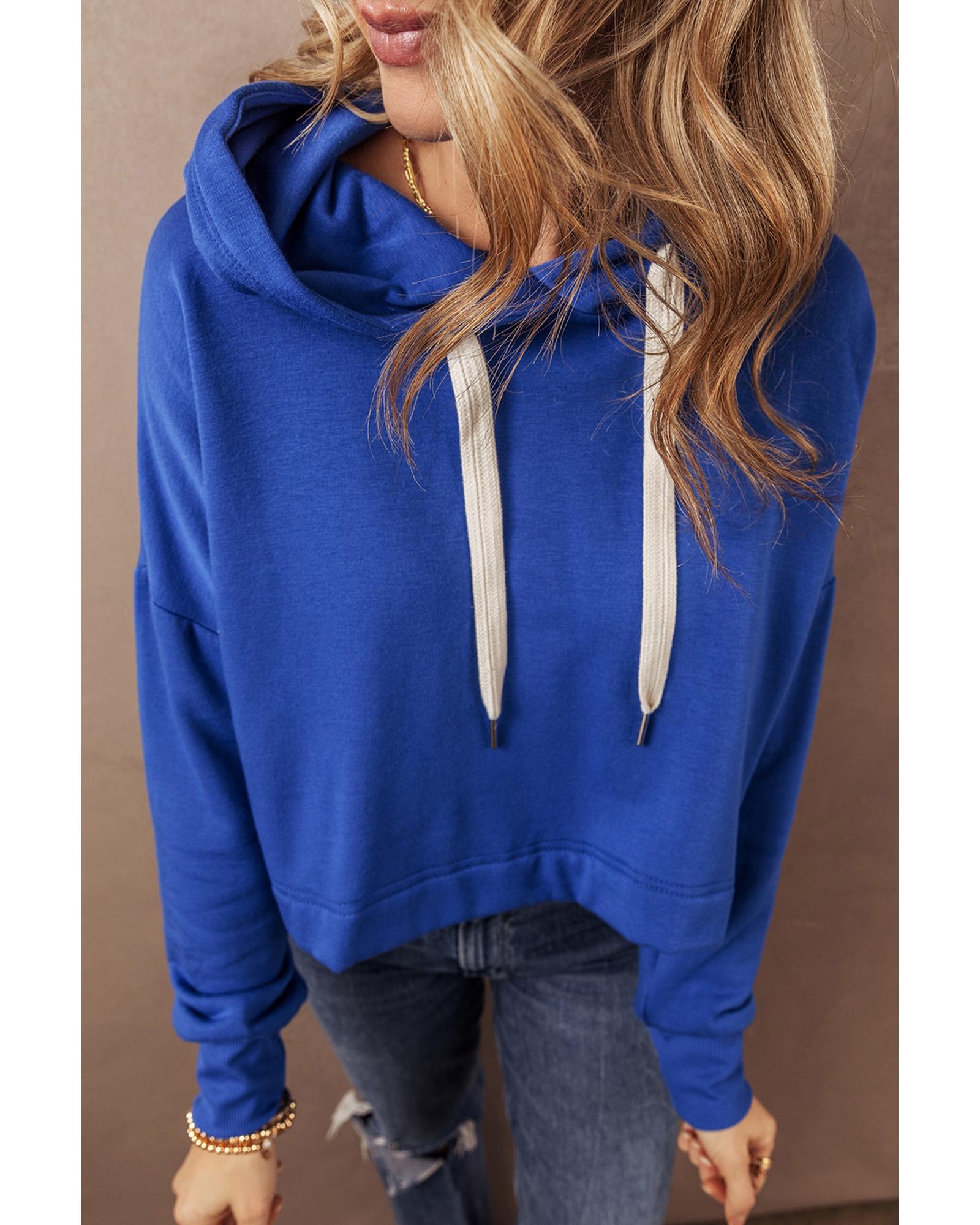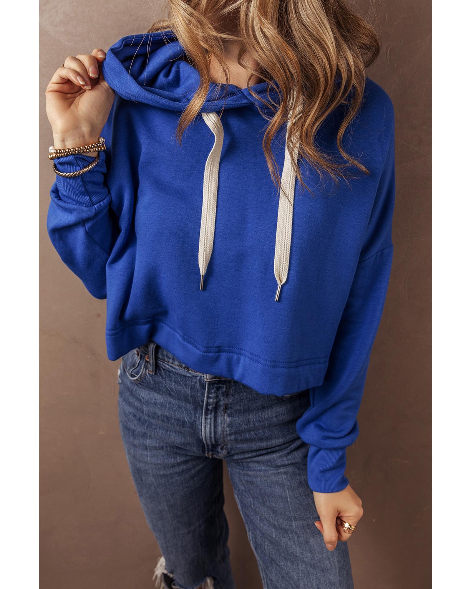 Dark Blue Solid Drop Shoulder Drawstring Cropped Hoodie – L