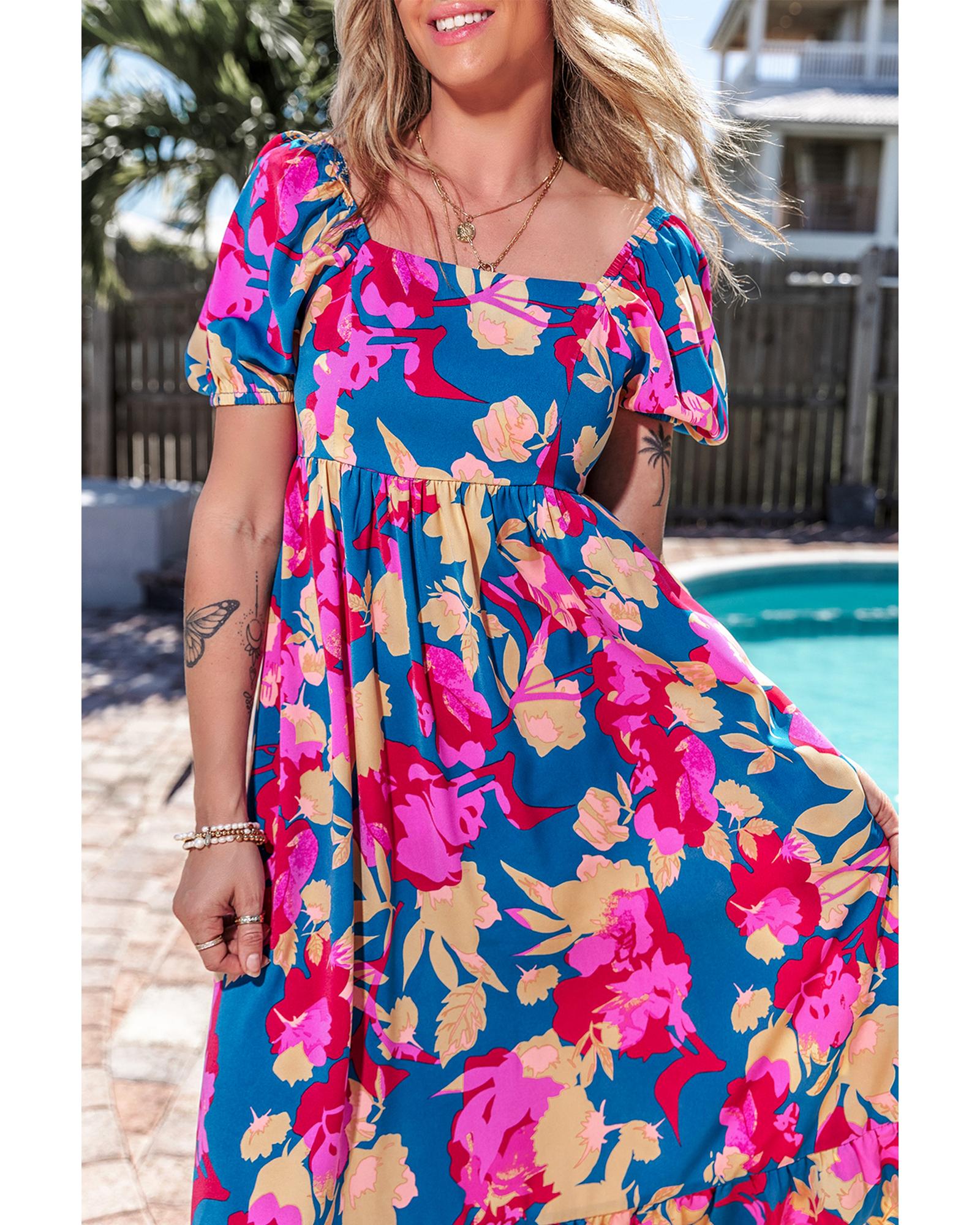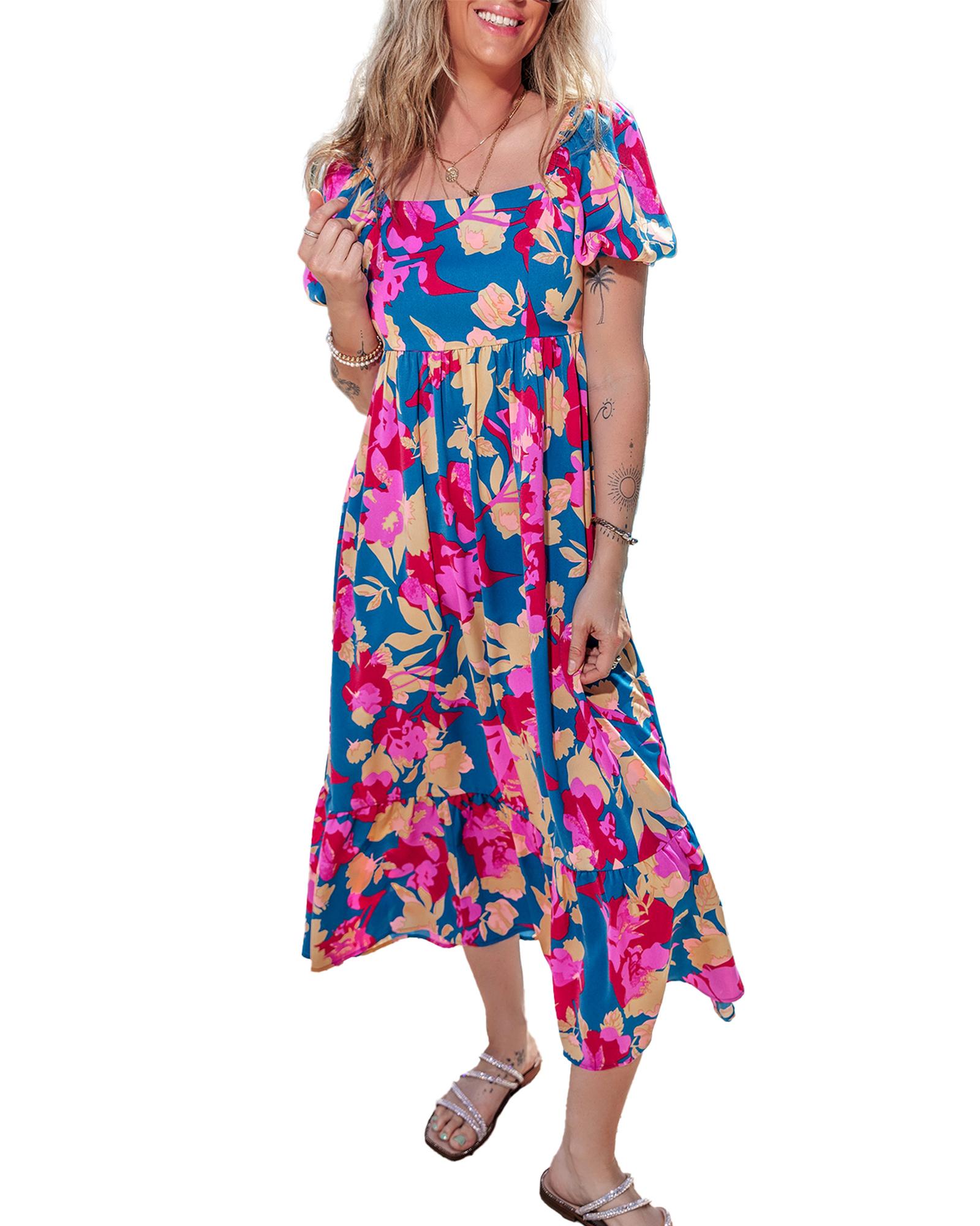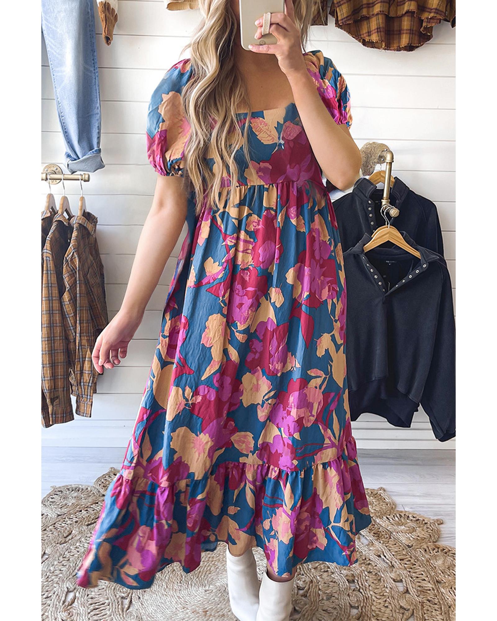 Dark Blue Square Neck Bubble Sleeve Ruffled Floral Dress – L