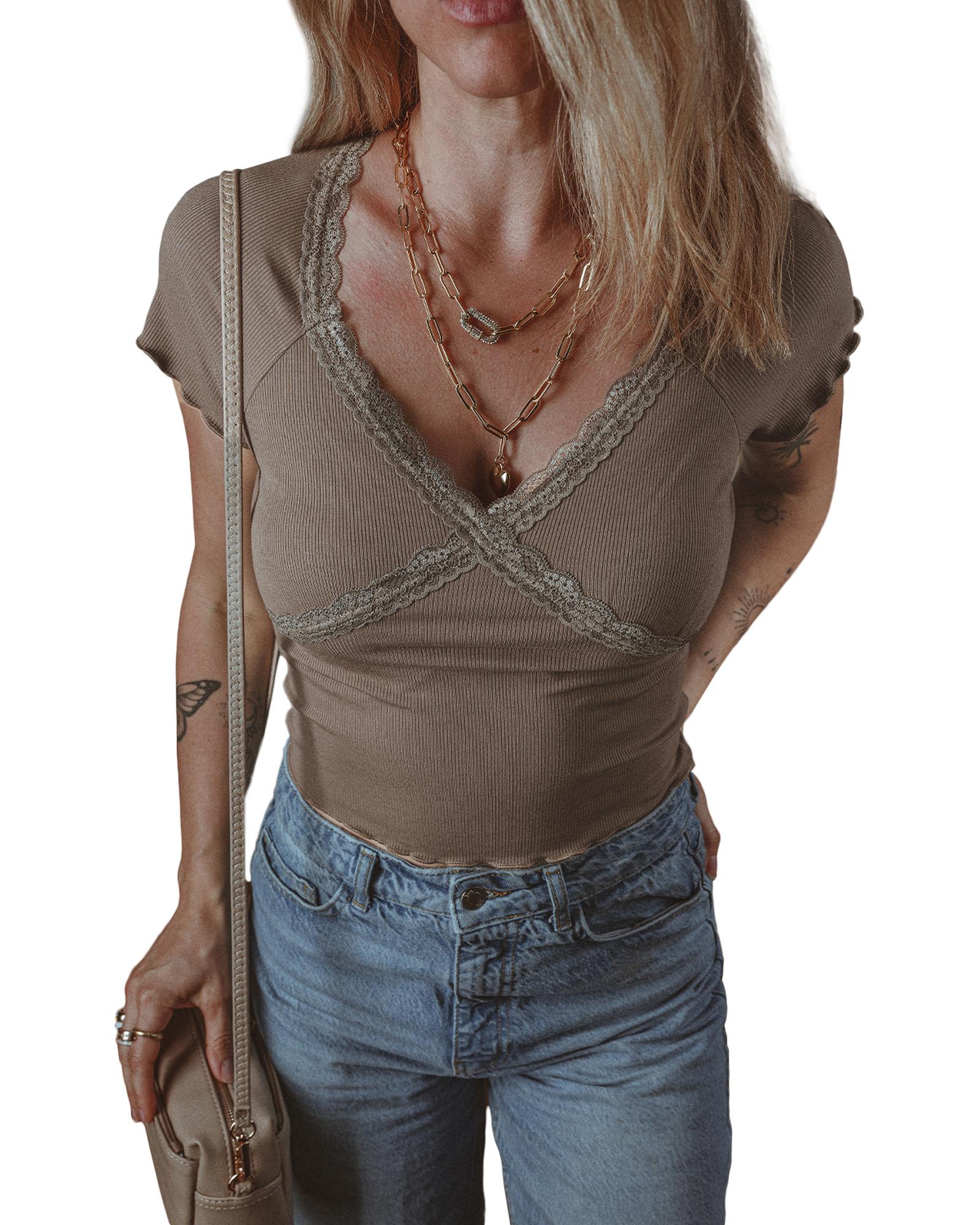 Dark Brown Lace Splicing Criss Cross Slim Fit V Neck T Shirt – S