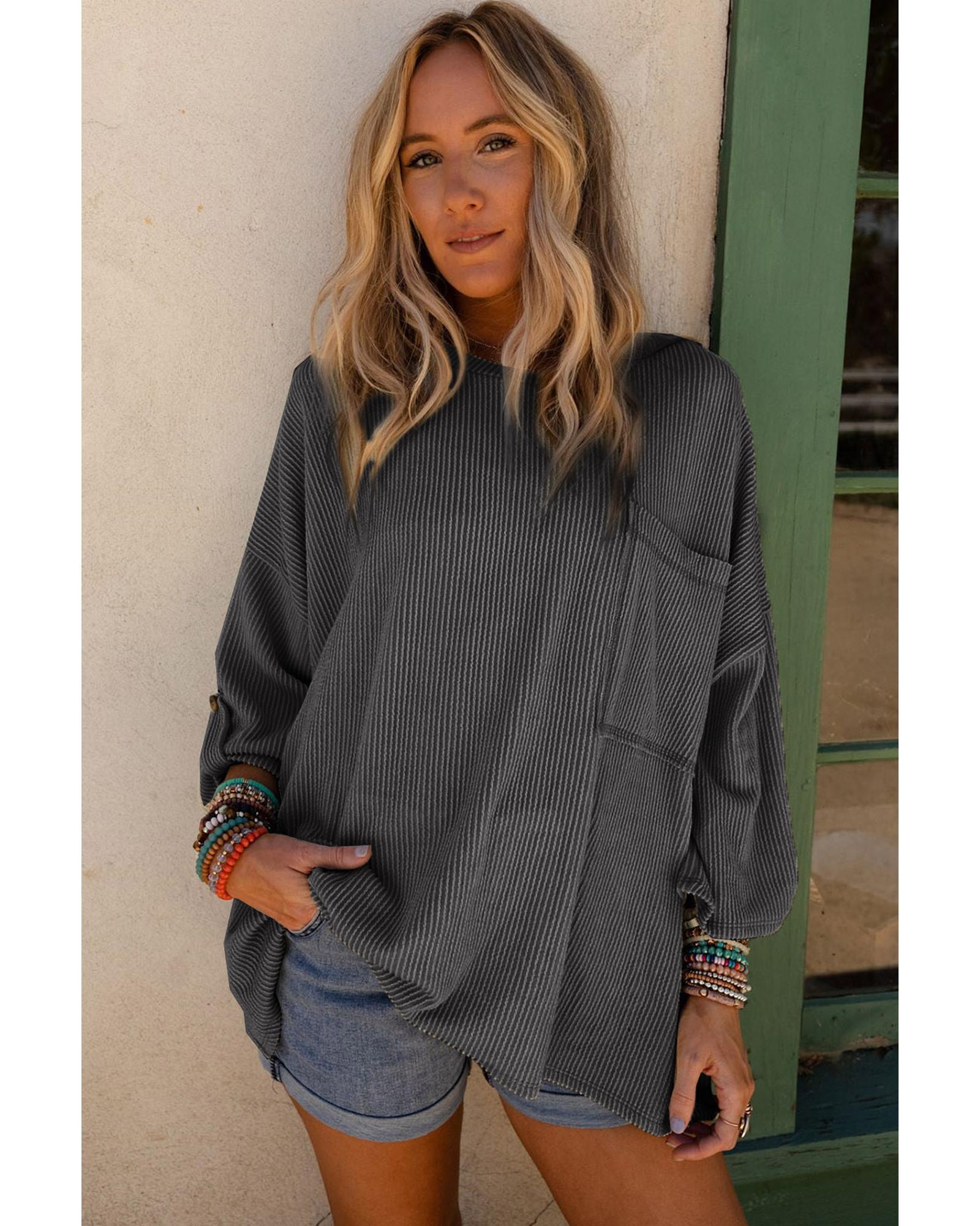 Dark Gray Ribbed Roll-tab Sleeve Chest Pocket Oversize Top – S