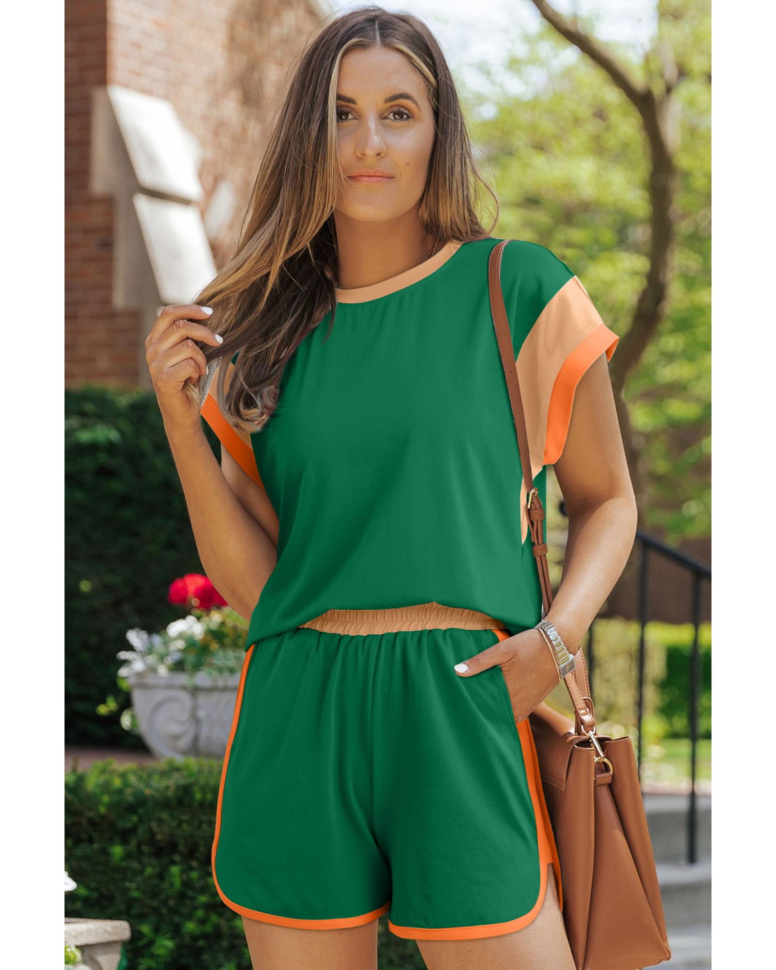 Dark Green Contrast Trim Cap Sleeve Tee Shorts Set - M