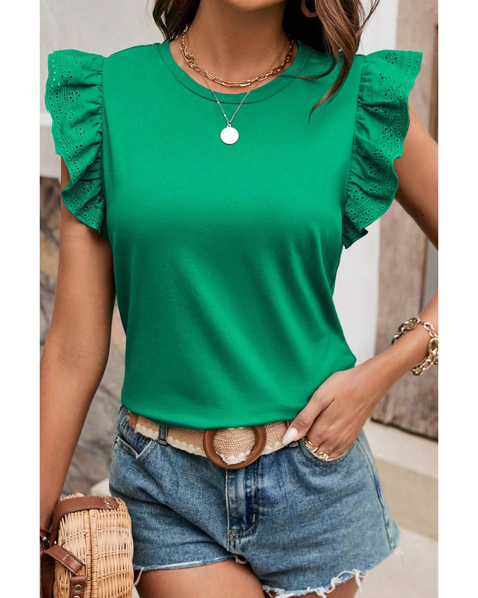 Dark Green Embroidered Ruffled Sleeve Slim Fit Crew Neck Top – L