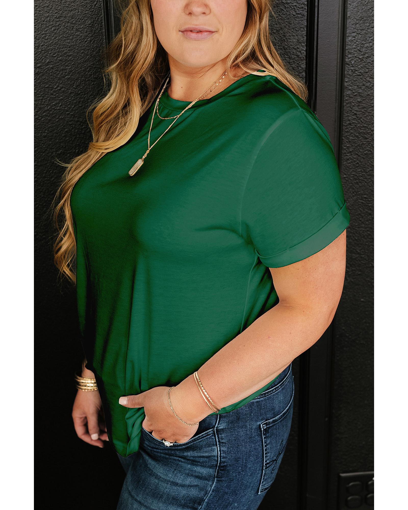 Dark Green Round Neck Rolled Sleeve Plus Size T-shirt – 4X