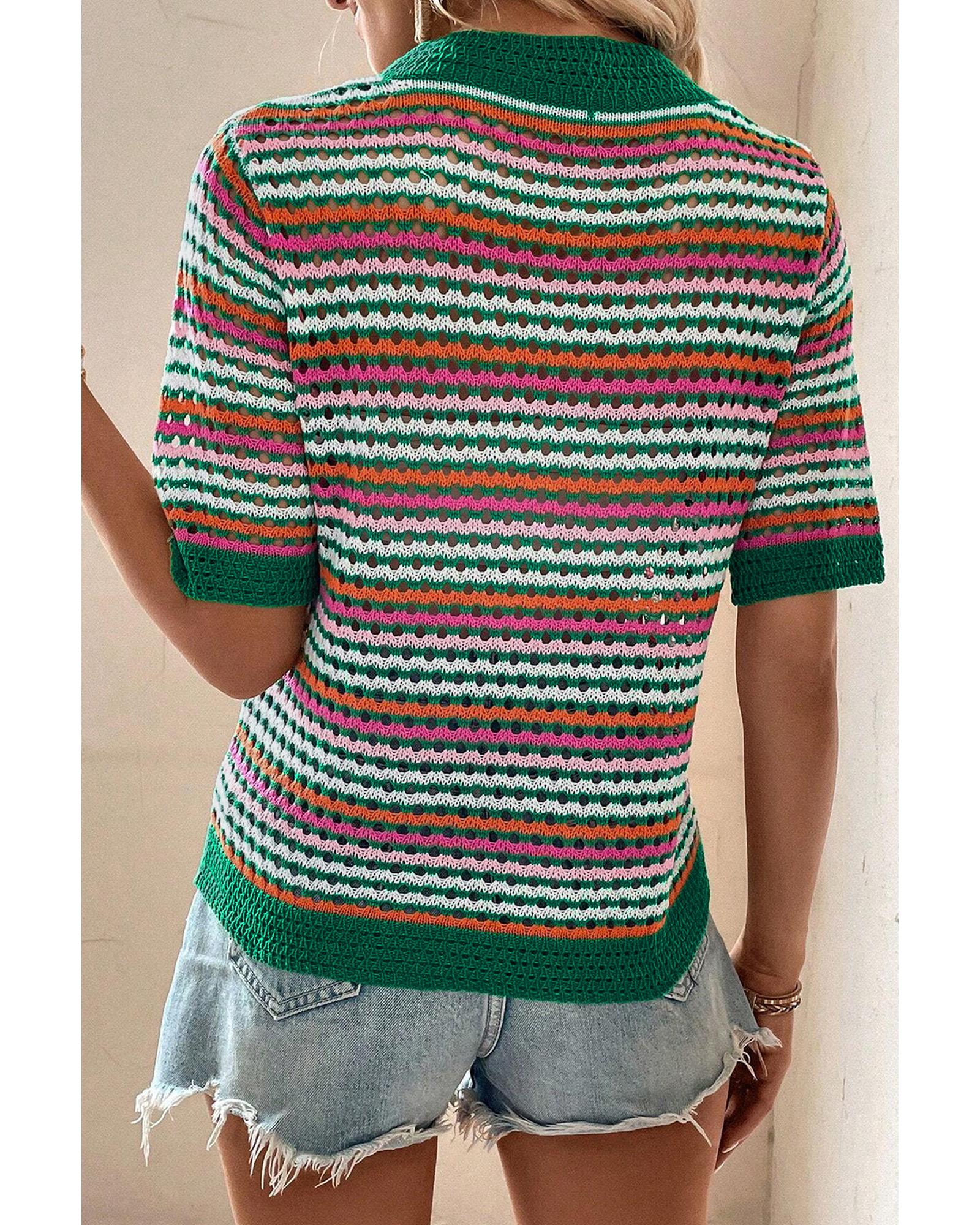 Dark Green Striped Pattern Contrast Trim Pointelle Knit T Shirt – XL